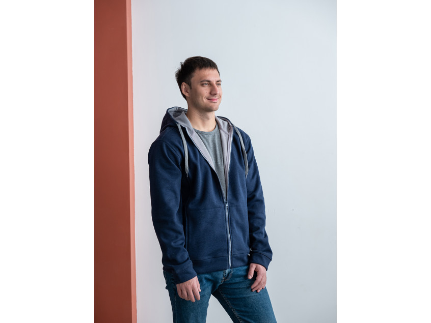 Мужская толстовка прямого силуэта с капюшоном комфортной глубины, втачным рукавом, прорезным карманов и застежкой на контрастную молнию. Капюшон дополнен плоским шнурком для регулировки прилегания, манжет и низ изделия выполнены из основного полотна.