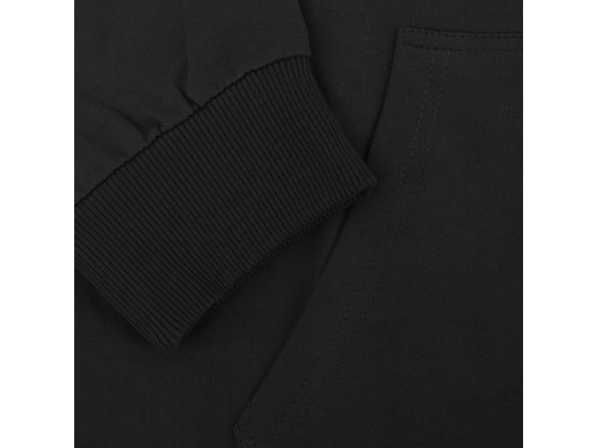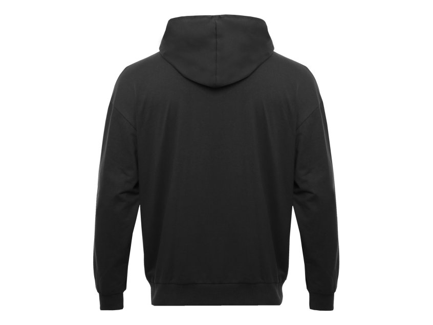 Толстовка оверсайз-силуэта с глубоким капюшоном, спущенной линией плеча, карманом-кенгуру и застежкой на молнию. Глубина капюшона регулируется шнурком с пластиковым наконечником, а рукав и низ изделия дополнены плотной эластичной резинкой.
