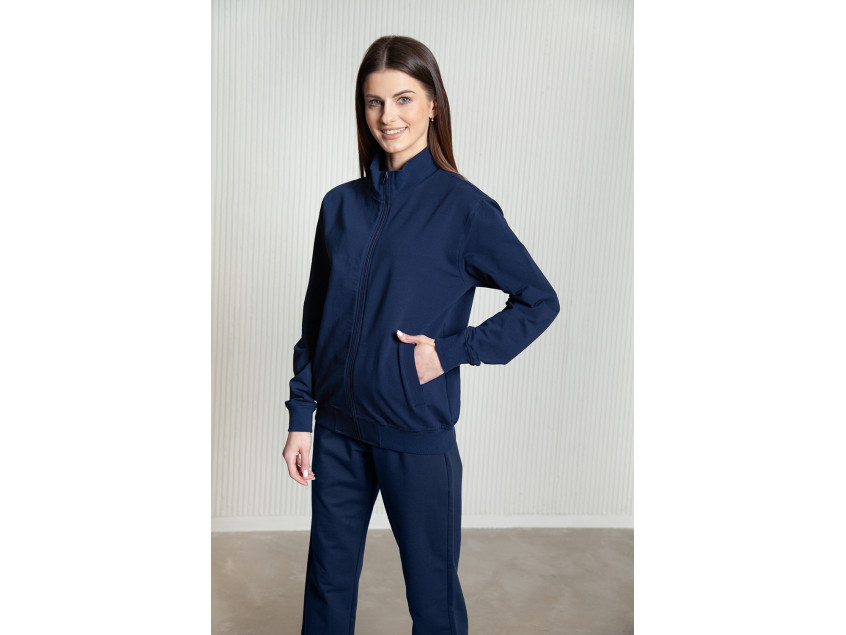 Олимпийка свободного силуэта с воротником-стойкой, втачным рукавом, прорезным карманом и застежкой на молнию. Манжет и низ изделия оформлены широкой эластичной резинкой в тон основному цвету.