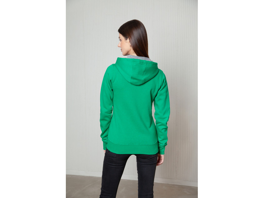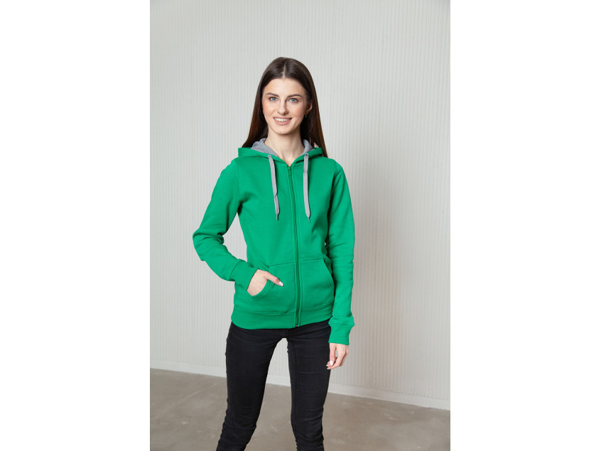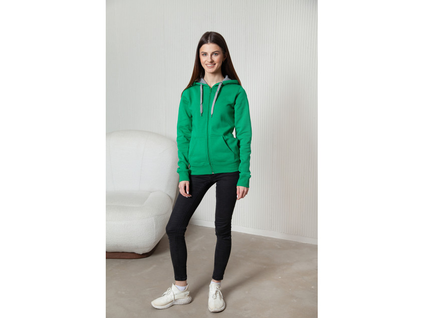 Женская толстовка приталенного кроя с капюшоном комфортной глубины, втачным рукавом, накладным карманом и застежкой на молнию в тон основному цвету. Для дополнительной защиты от холода ворот, манжет и низ изделия оформлены эластичной бейкой.