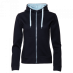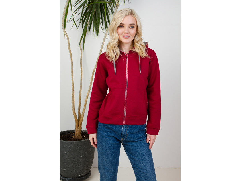 Женская толстовка прямого силуэта с капюшоном комфортной глубины, втачным рукавом, прорезным карманов и застежкой на контрастную молнию. Капюшон дополнен плоским шнурком для регулировки прилегания, манжет и низ изделия выполнены из основного полотна.