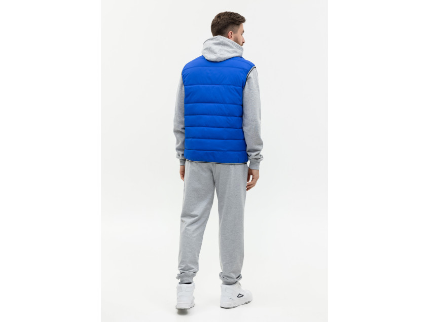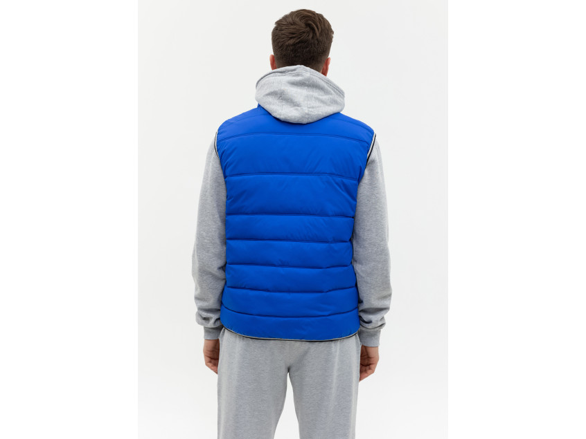 Мужской жилет прямого силуэта с геометричной стежкой, воротником-стойкой, прорезным карманом и застежкой на молнию. Изделие дополнено контрастной резинкой по пройме и линии низа для дополнительной защиты от холода и ветра.