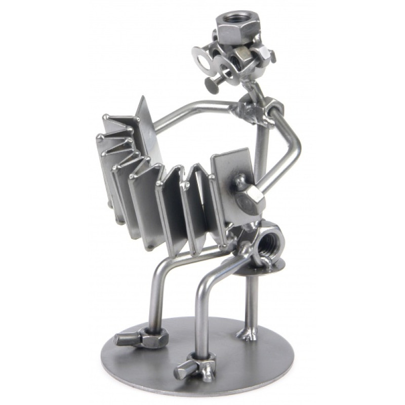 Металлические фигурки — ручная работа талантливого дизайнера из Германии. Нет такой области в жизни, что не вдохновила бы его на создание очередной металлической фигурки причудливой формы, отличительной особенностью которой является использование таких предметов, как болты, гайки, проволока, различные пластины и т. п. Необыкновенный стиль, который можно трактовать как Modern, Hi-Tech или даже Steampunk, сделали фигурки популярными во всём мире. Фигурка "Баянист-виртуоз" станет отличным подарком вашим друзьям и коллегам музыкантам.