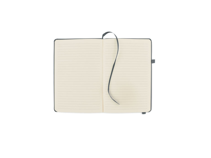 Блокнот формата A5 с обложкой из переработанного полиуретана. Переплет. 192 линованные страницы из переработанной бумаги (96 листов). Эластичный ремешок и крепление для маркеров и ручек.
