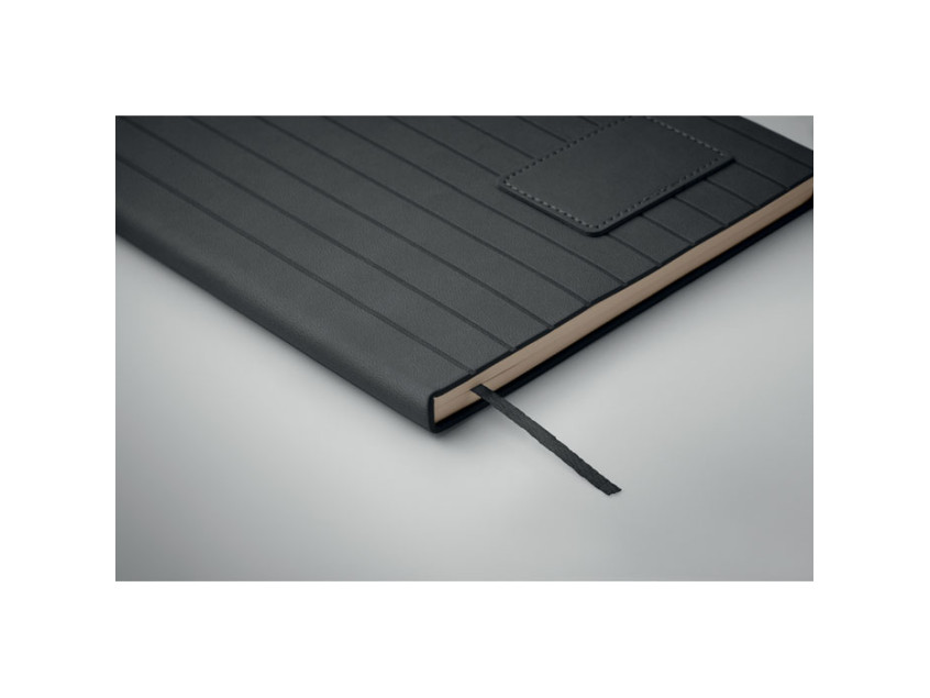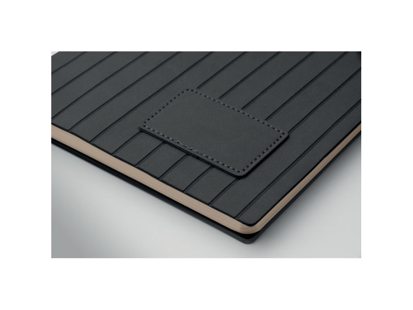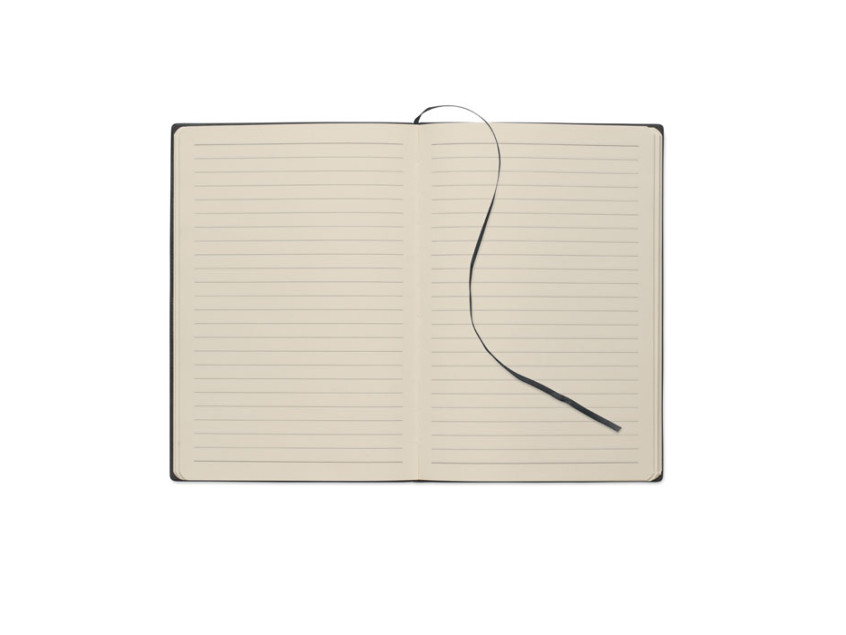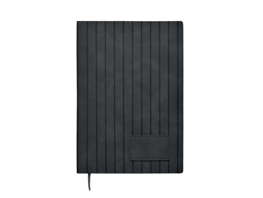 A5 notebook with soft smokey PU ribbed cover in 40% recycled post consumer and 60% PU with plain PU patch. 160 lined pages, 70gsm recycled paper (80 sheets). Matching colour polyester ribbon page marker.