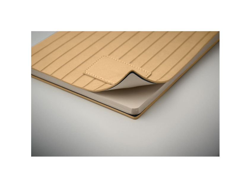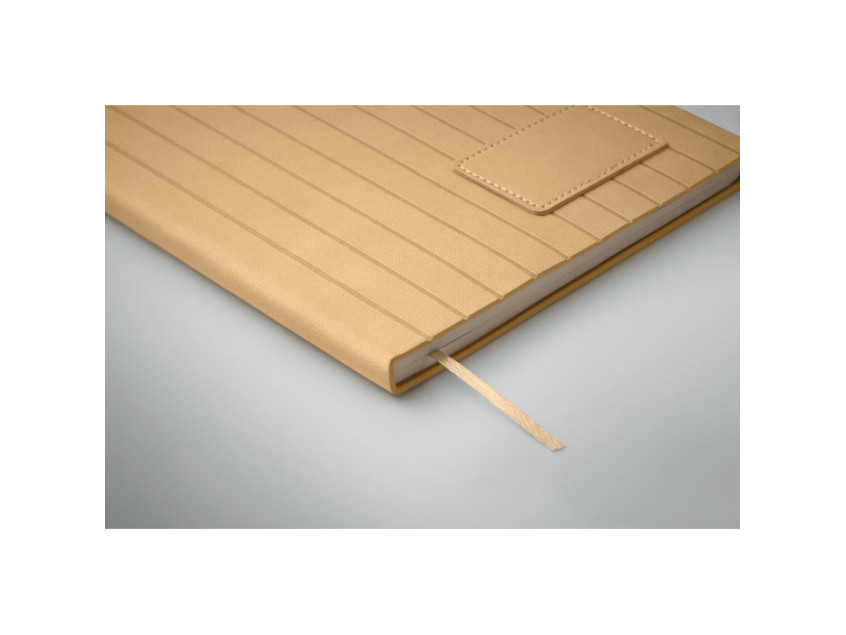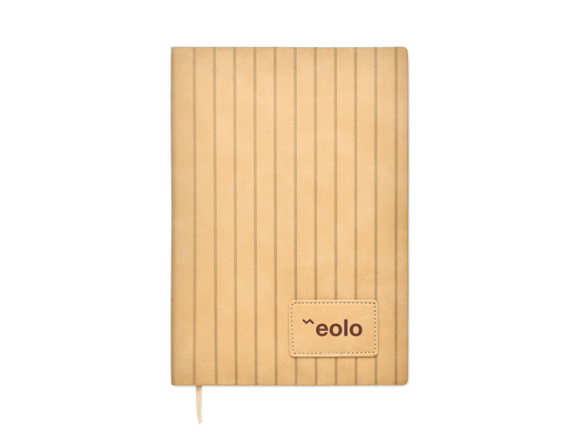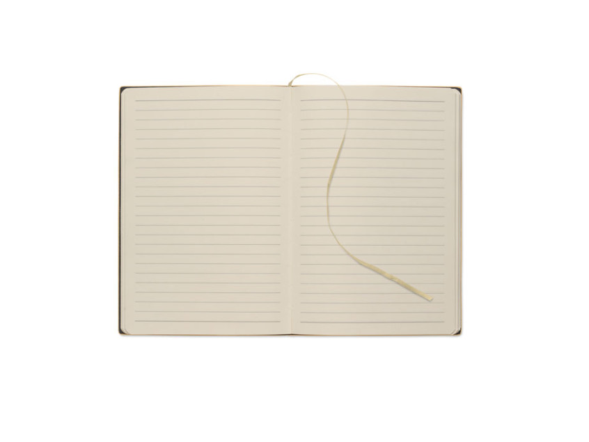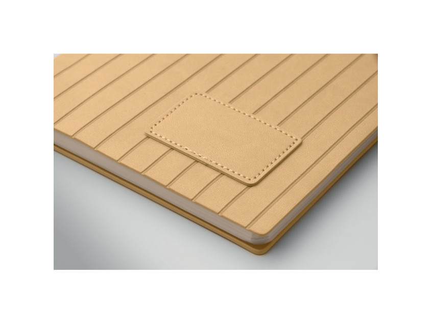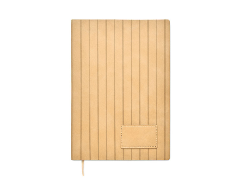 A5 notebook with soft smokey PU ribbed cover in 40% recycled post consumer and 60% PU with plain PU patch. 160 lined pages, 70gsm recycled paper (80 sheets). Matching colour polyester ribbon page marker.
