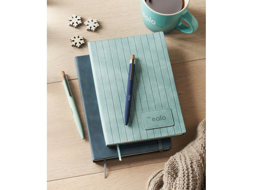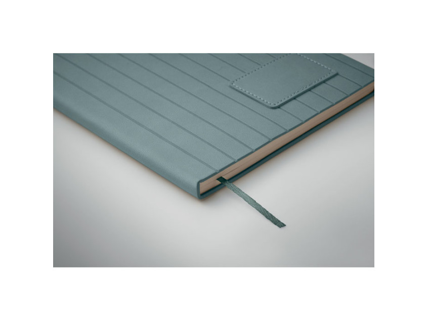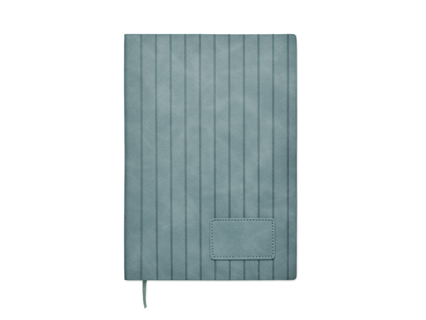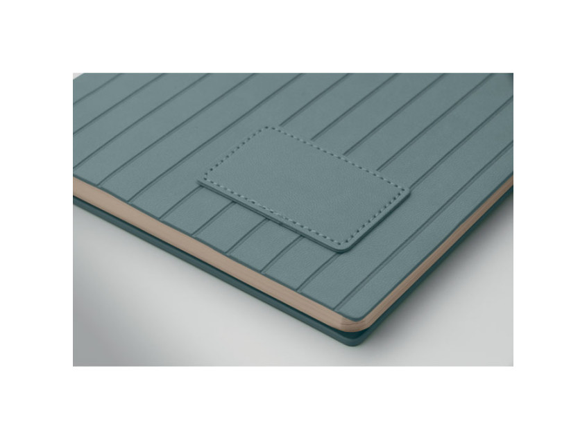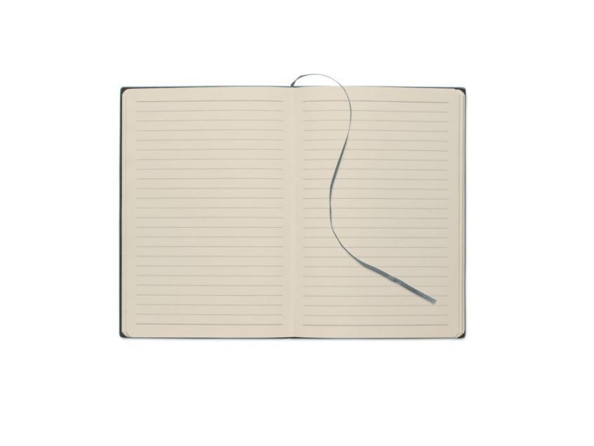 A5 notebook with soft smokey PU ribbed cover in 40% recycled post consumer and 60% PU with plain PU patch. 160 lined pages, 70gsm recycled paper (80 sheets). Matching colour polyester ribbon page marker.