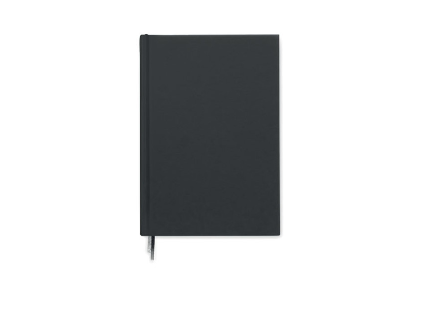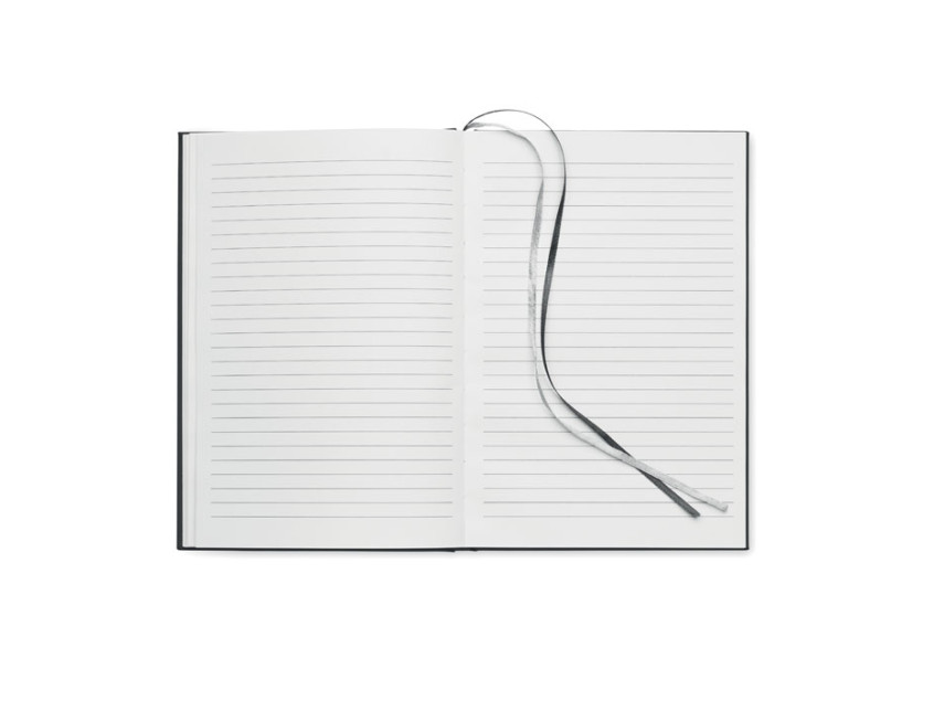 A5 journal notebook in 60% recycled post consumer polyester and 40% PU cover. Casebound. 256 lined pages in 70gsm recycled paper (128 sheets). With 2 polyester ribbon page markers.
