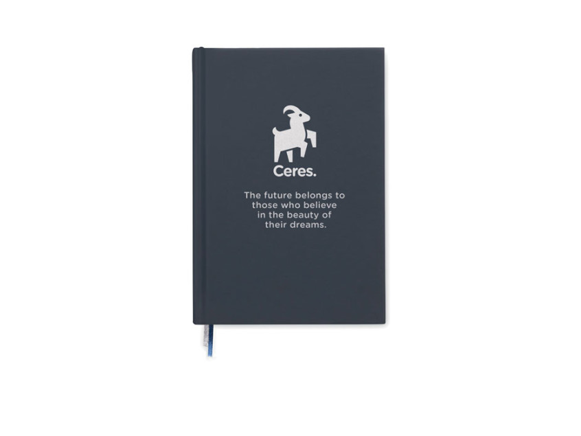 A5 journal notebook in 60% recycled post consumer polyester and 40% PU cover. Casebound. 256 lined pages in 70gsm recycled paper (128 sheets). With 2 polyester ribbon page markers.