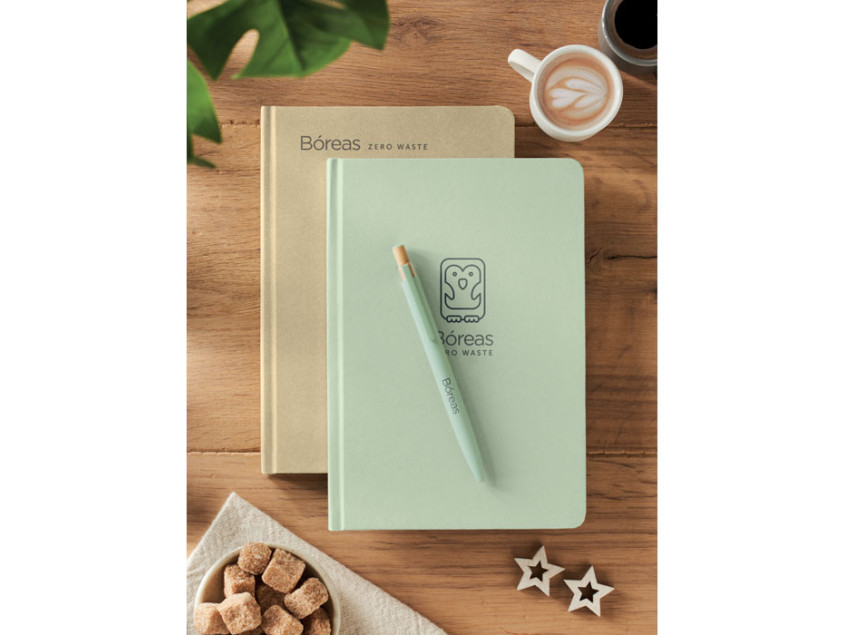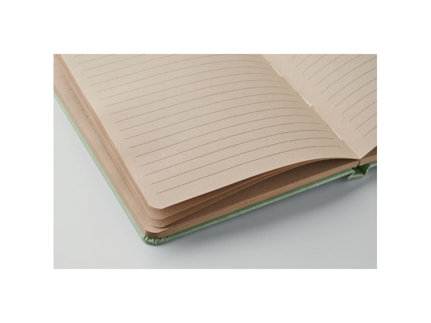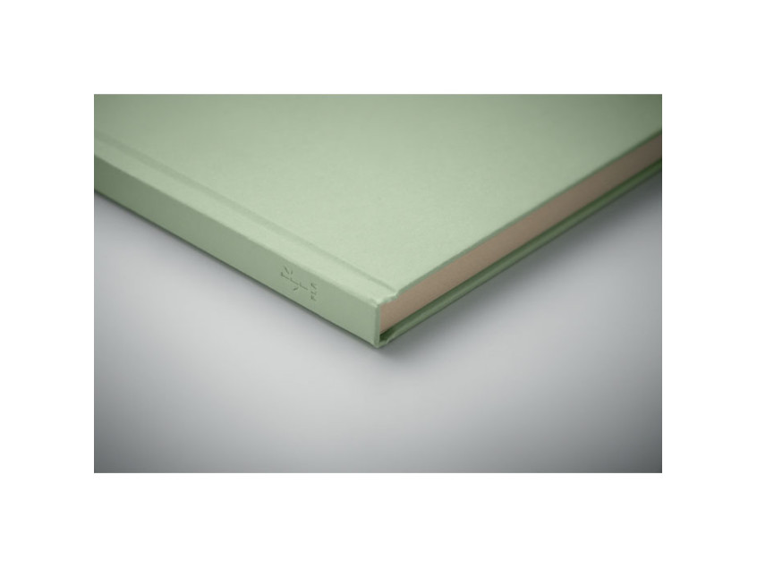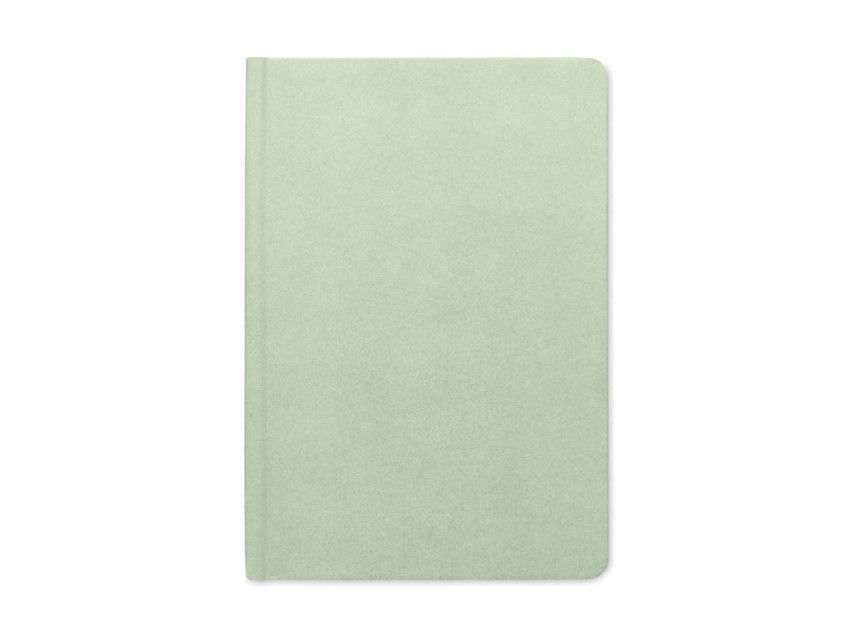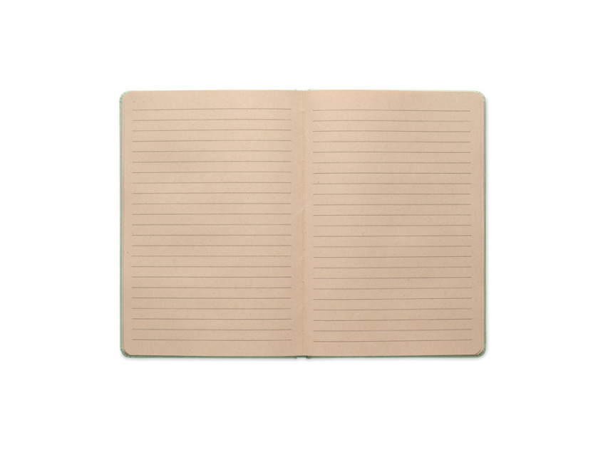 A5 notebook with hard cover and 160 lined paper pages (80 sheets) in PLA sugarcane (65% Sugarcane fibre/35% paper). Casebound.