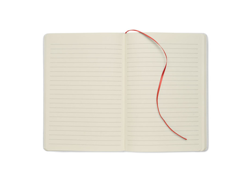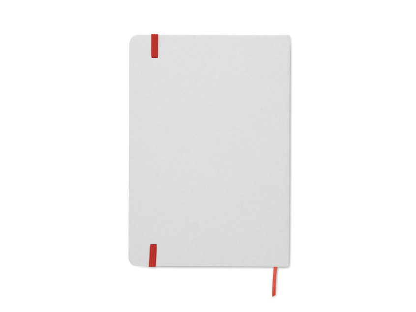 Блокнот A5 в твердой белой обложке из переработанного картона. В переплете. 160 линованных страниц из переработанной бумаги (80 листов). В результате гравировки на обложке лого вскрывается цветом эластичного ремешка и закладки.