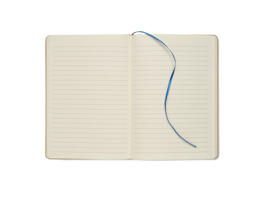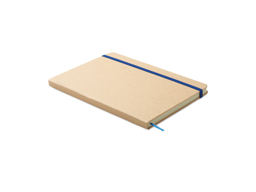Блокнот A5 в твердой бежевой обложке из переработанного картона. В переплете. 160 линованных страниц из переработанной бумаги (80 листов). В результате гравировки на обложке лого вскрывается цветом эластичного ремешка и закладки.