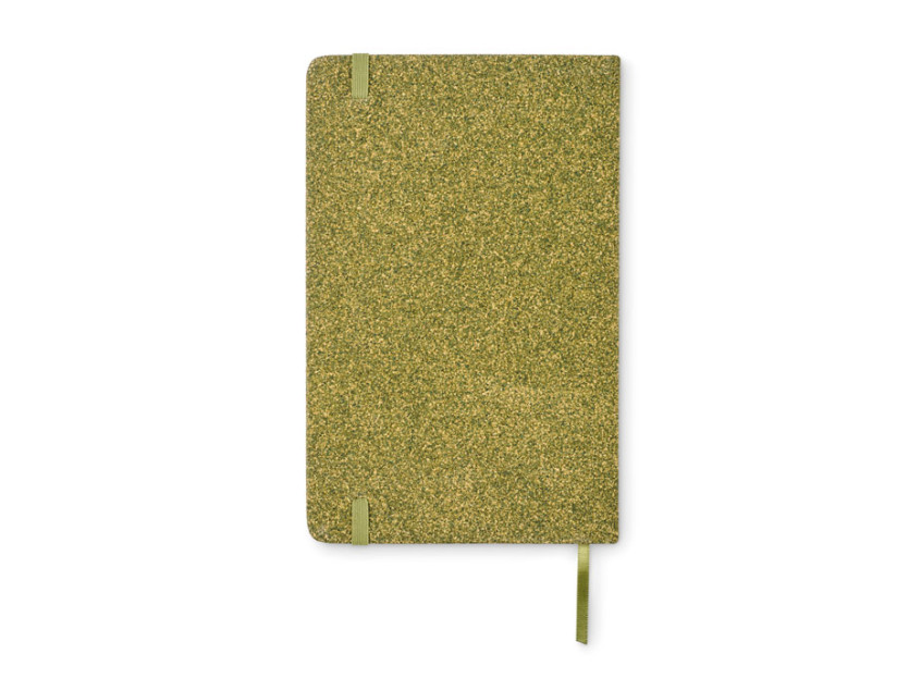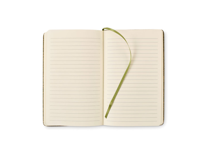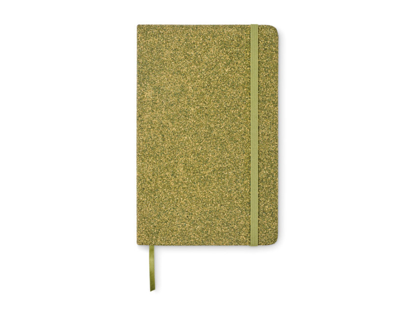 A5 notebook with hard cover made of 20% tea grounds, 30% cork and 50% polycotton cloth. Casebound.160 lined recycled paper pages (80 sheets/70gsm). Matching elastic closure strap and ribbon page-marker. FSC®-certified | FSC MIX CREDIT, N7.1, FSC-C213206