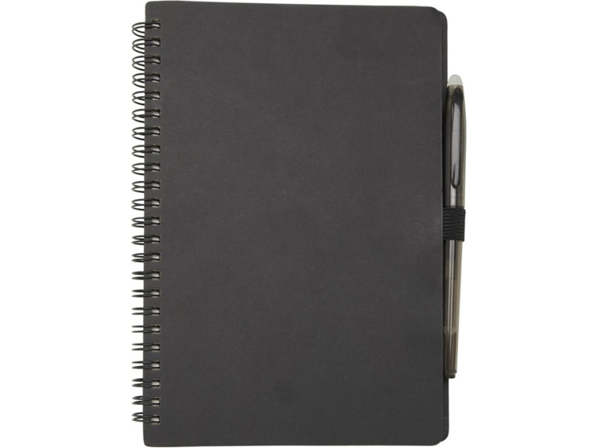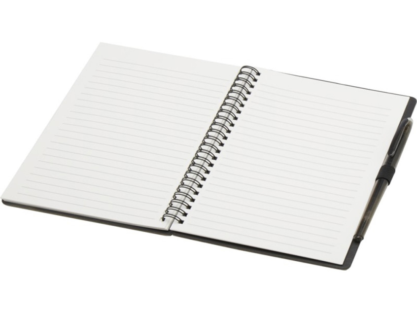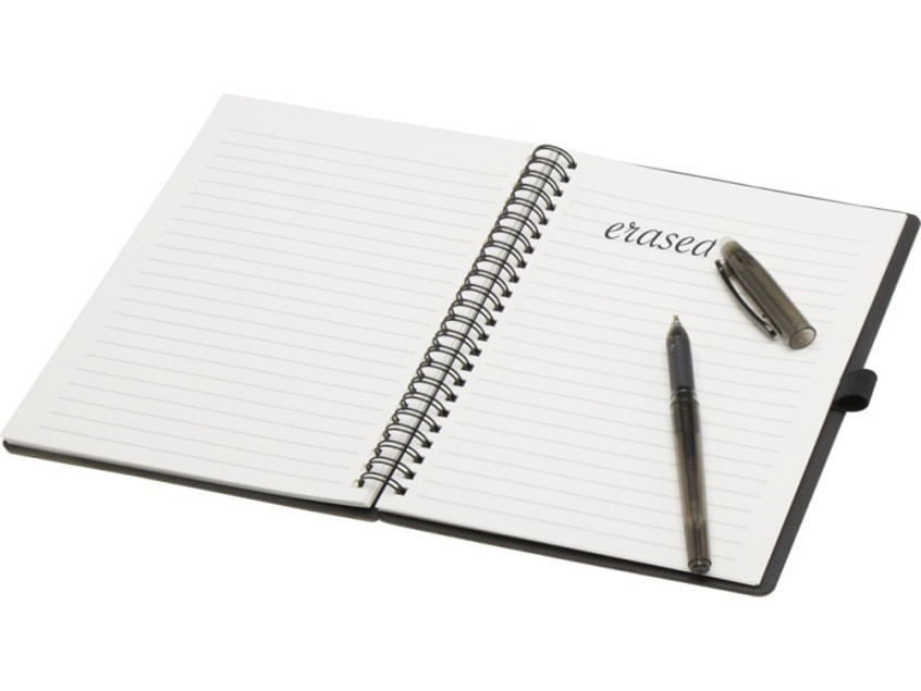 Многоразовый набор из ручки и блокнота в мягкой обложке из каменной бумаги. Блокнот имеет обложку из картона, закругленные углы и 32 листа линованной бумаги плотностью 120 г/м². В производстве каменной бумаги не используется дерево, а на сам процесс изготовления затрачивается гораздо меньше энергии в сравнении с производством переработанной или целлюлозной бумаги. Сзади имеется карман для хранения черной протирочной ткани (входит в комплект). Ручка из переработанного пластика с стираемыми чернилами, прозрачным корпусом, белым ластиком сверху и однотонной цветной рукояткой. Цвет чернил: черный. Длина непрерывной линии: 250 метров. Размер пера: 0,7 мм.