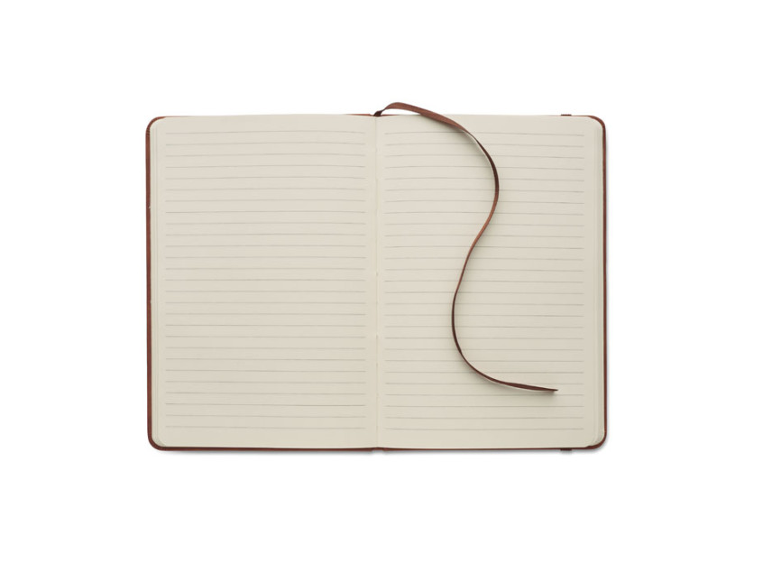 A5 notebook in 40% recycled post consumer smokey hard PU cover and 60% PU cover. Casebound. 160 lined pages, 70gsm recycled paper (80 sheets). Matching elastic closure strap and ribbon page marker.