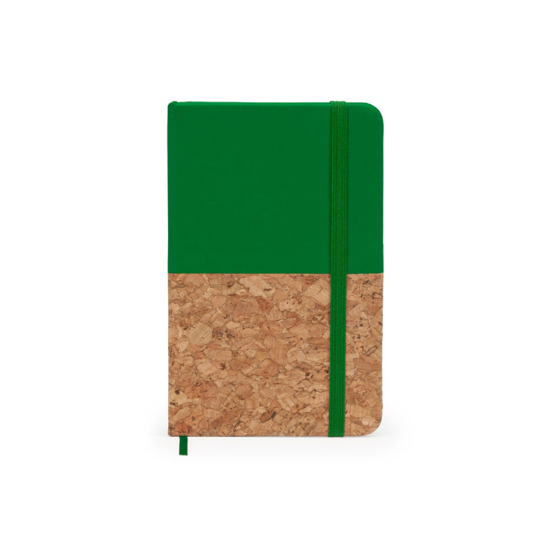 Блокнот формата А6. Комбинированная обложка из искусственной кожи и пробки. 80 нелинованных листов. Также у блокнота есть ляссе и резинка для фиксации.