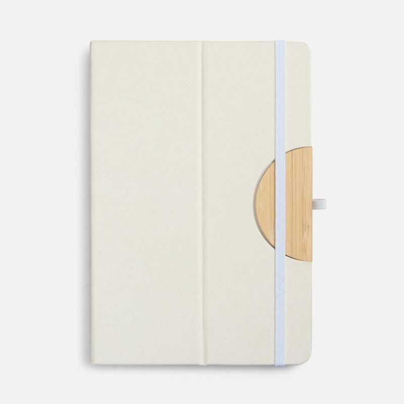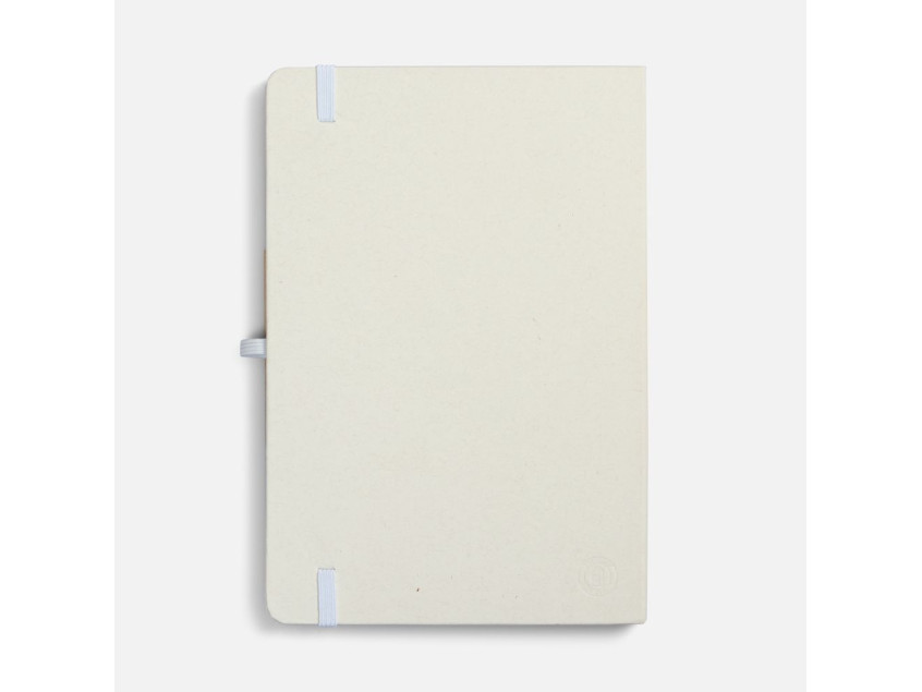 Блокнот на спирали из переработанных молочных пакетов, дополнен цветными петлей-резинкой для ручки, белым ляссе и резинкой на обложку.