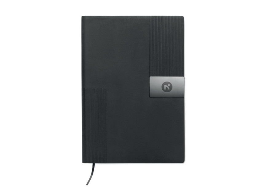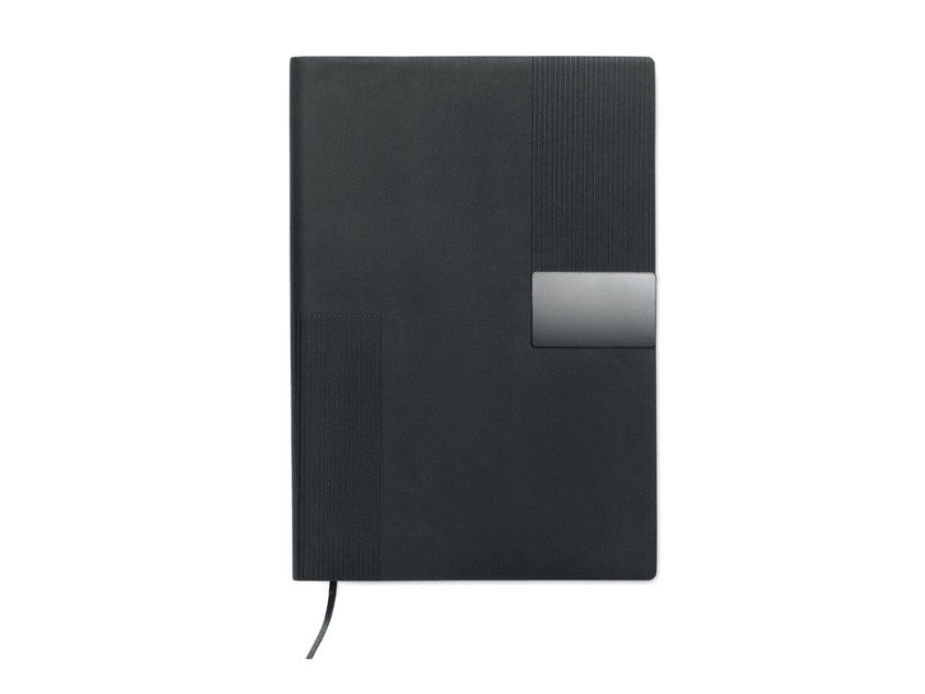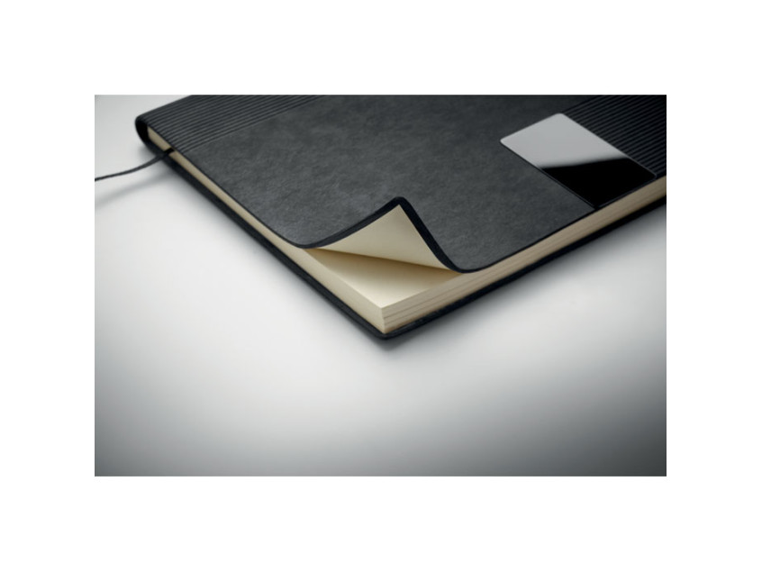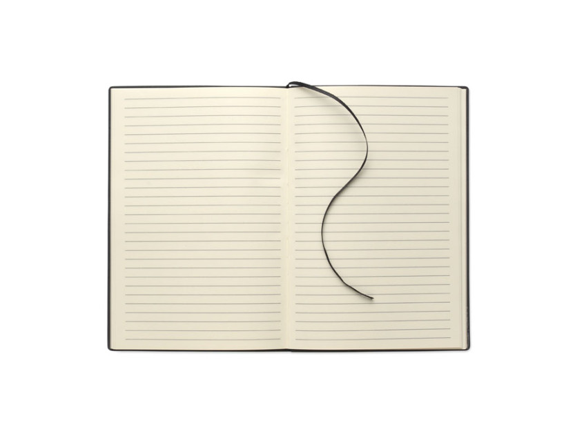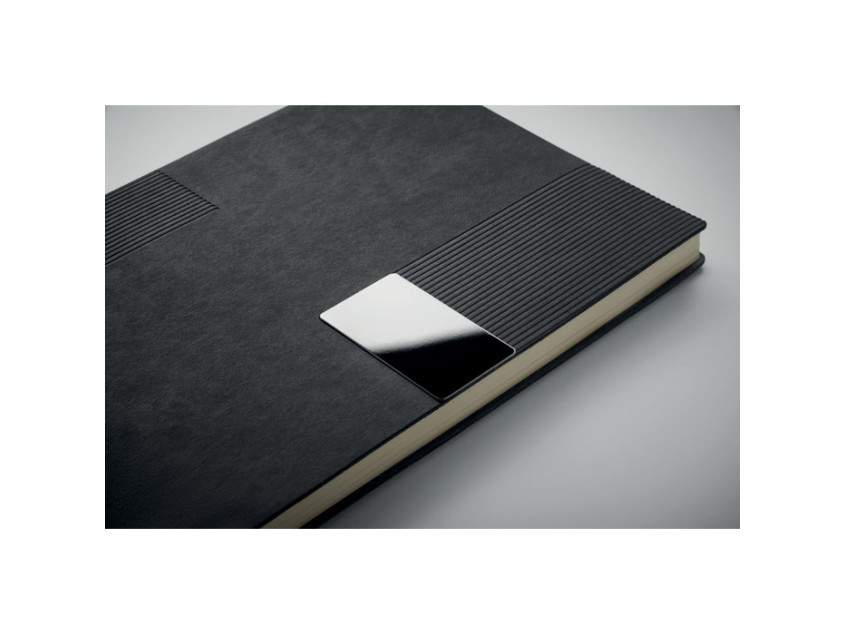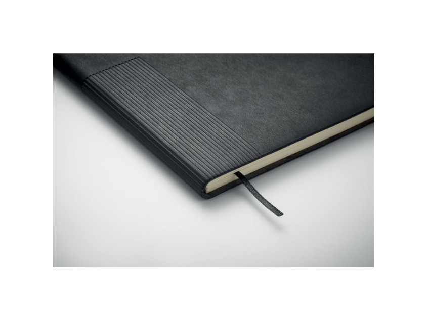 A5 PU notebook with soft cover. Casebound. 160 lined recycled paper pages (80 sheets). Matching elastic band and ribbon bookmark. Metal detail on the front.