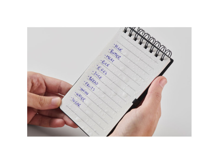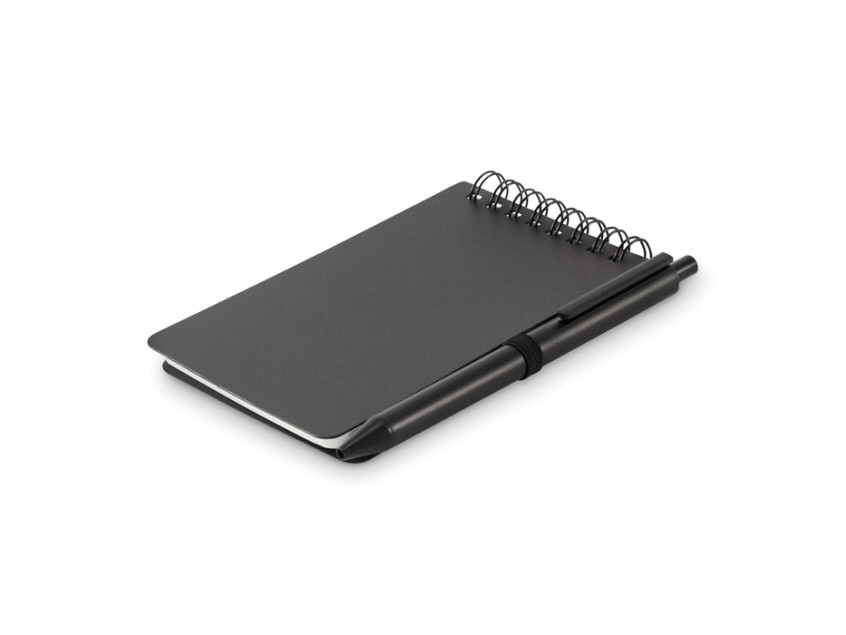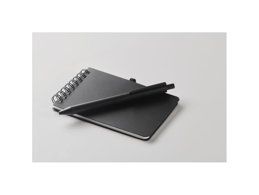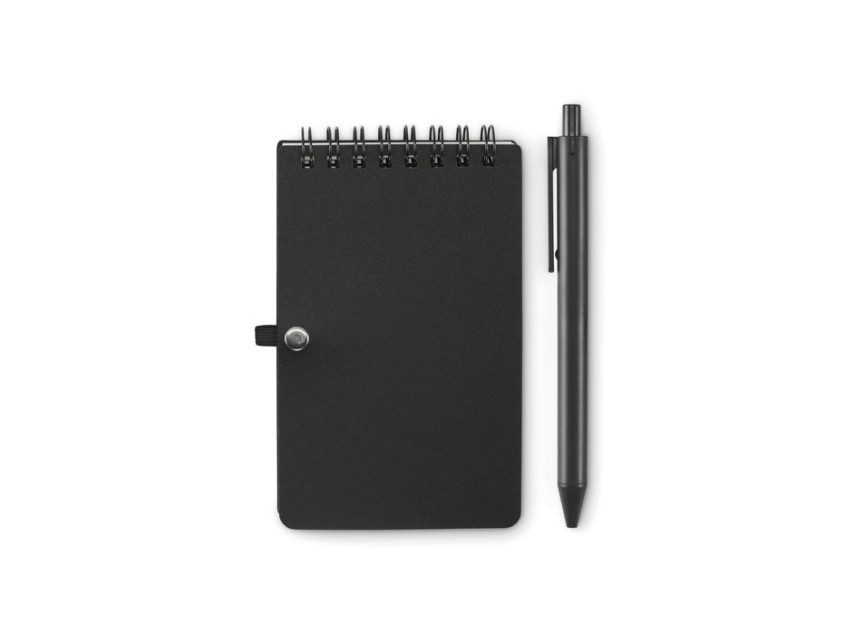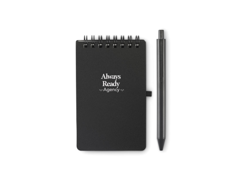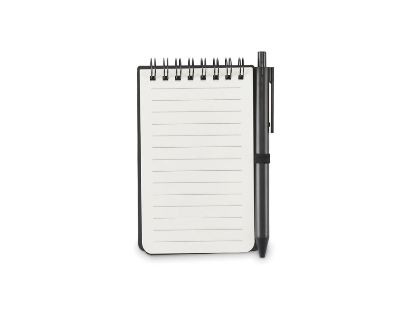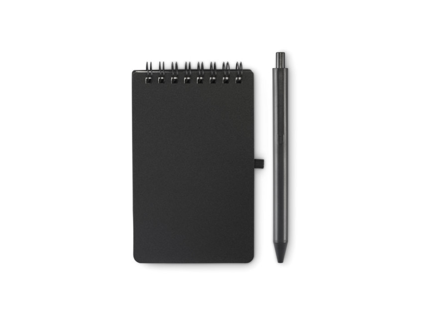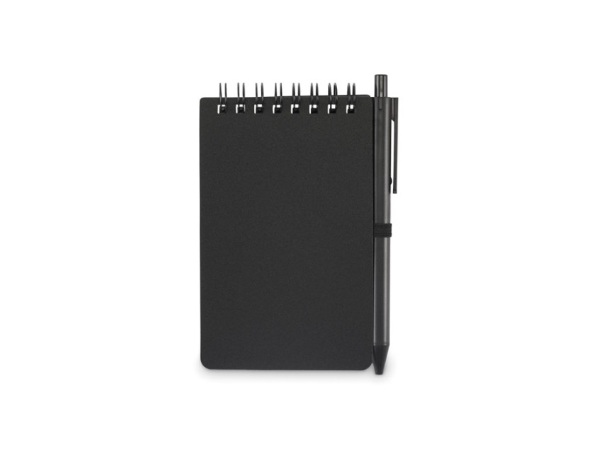 Блокнот в водоотталкивающей обложке из полипропилена с ручкой. Двойная проволока. Минеральная бумага 120 г/м², 50 листов в линейку. Синие чернила. Эластичный ремешок и держатель для ручки.