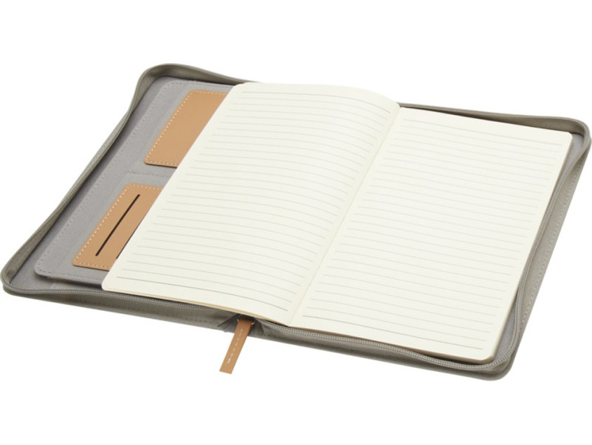Папка Nomumi формата А5 с закругленными углами — удобный и необходимый предмет в офисе, изготовленный из переработанного пластика. Содержит 64 листа кремового цвета плотностью 80 г/м2, застежку-молнию, петлю для ручки и карман-гармошку. Переработанный PET пластик, бумага.