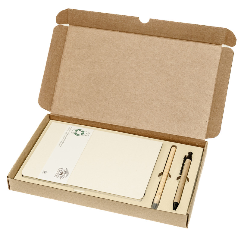 Подарочный набор в стильной картонной коробке бежевого цвета. Внутри на аккуратном ложементе располагаются ежедневник недатированный в твердом переплете и картонная ручка с колпачком.