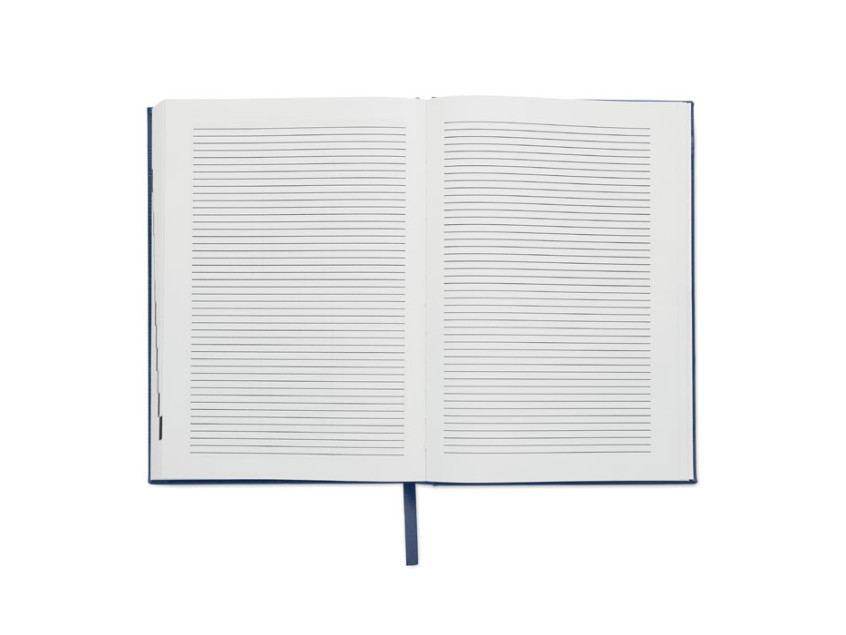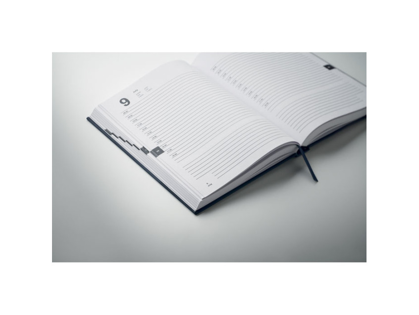 A5 daily diary notebook in 60% recycled post consumer polyester and 40% PU cover. 416 universal pages in 70gsm recycled paper (208 sheets). With matching colour polyester ribbon page marker.
