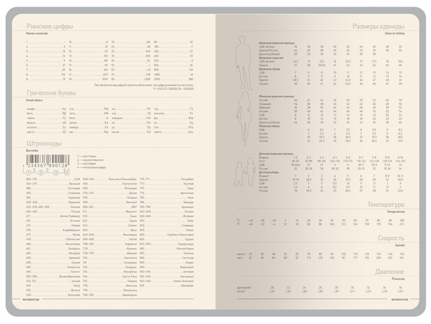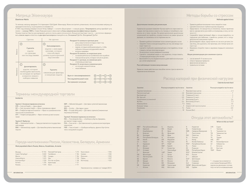 Недатированные страницы в серую линейку имеют отдельное место для проставления числа месяца и дня недели. Справочный блок на 17 страницах содержит полезную информацию из различных областей.