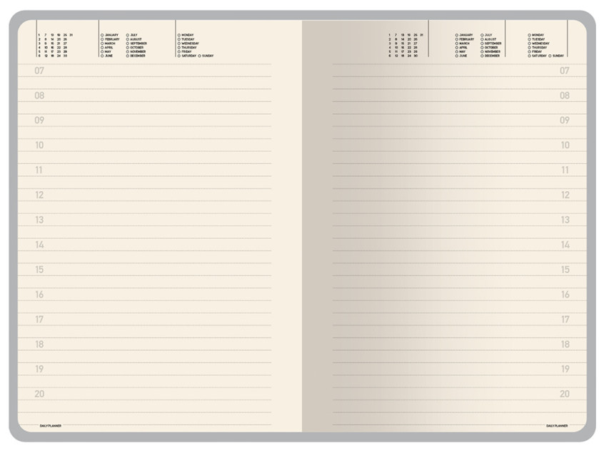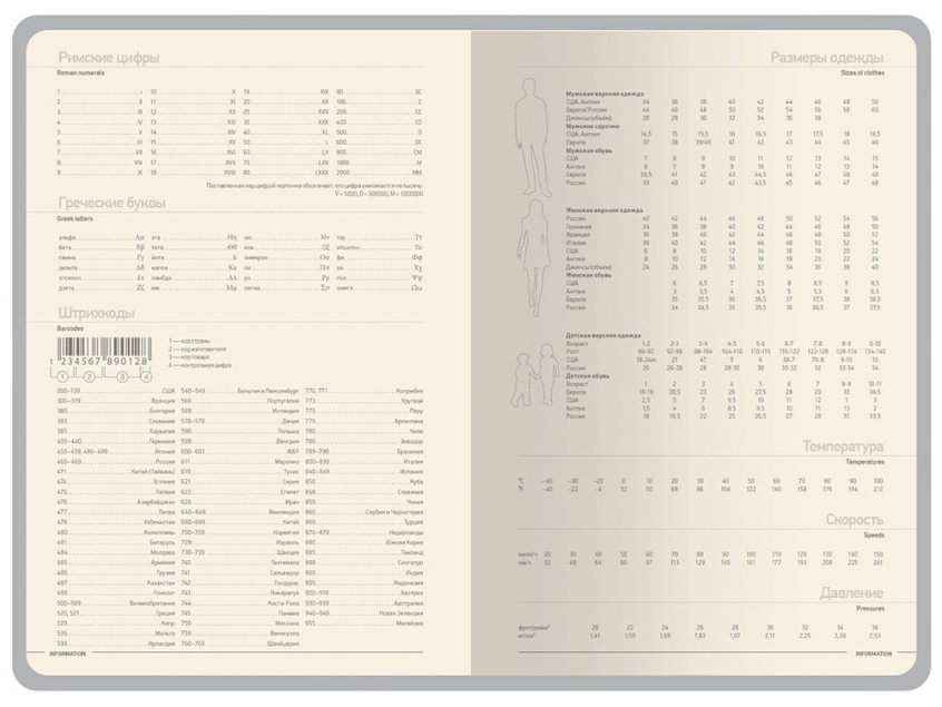 Недатированные страницы в серую линейку имеют отдельное место для проставления числа месяца и дня недели. Справочный блок на 17 страницах содержит полезную информацию из различных областей.