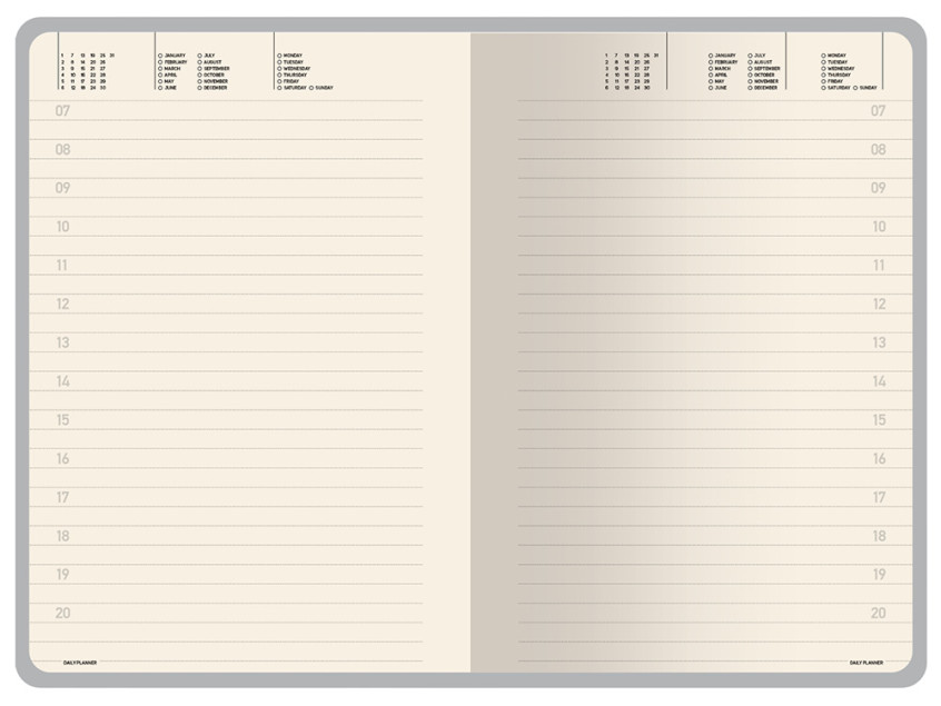 Недатированные страницы в серую линейку имеют отдельное место для проставления числа месяца и дня недели. Справочный блок на 17 страницах содержит полезную информацию из различных областей.