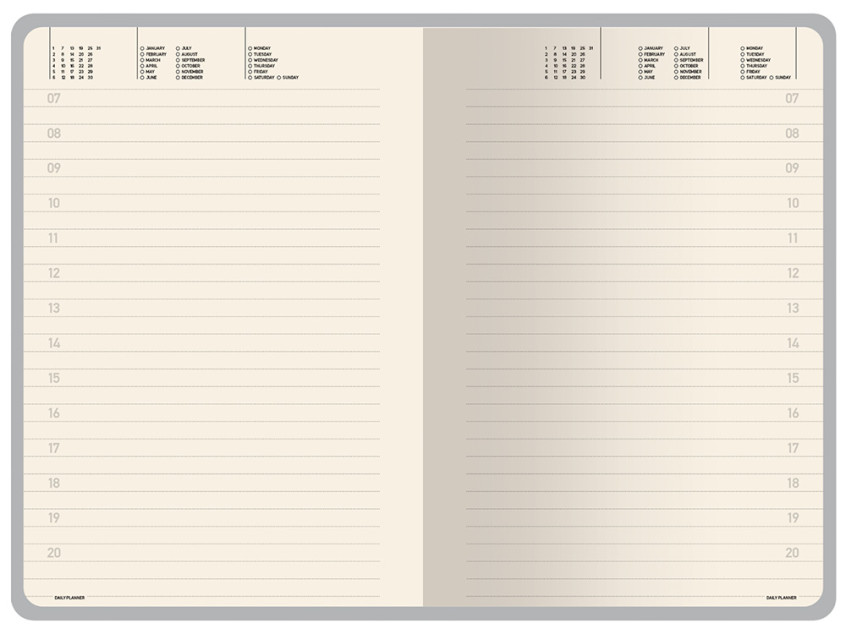 Недатированные страницы в серую линейку имеют отдельное место для проставления числа месяца и дня недели. Справочный блок на 17 страницах содержит полезную информацию из различных областей.