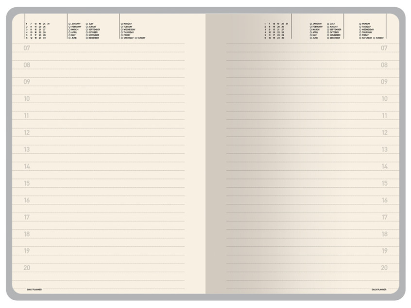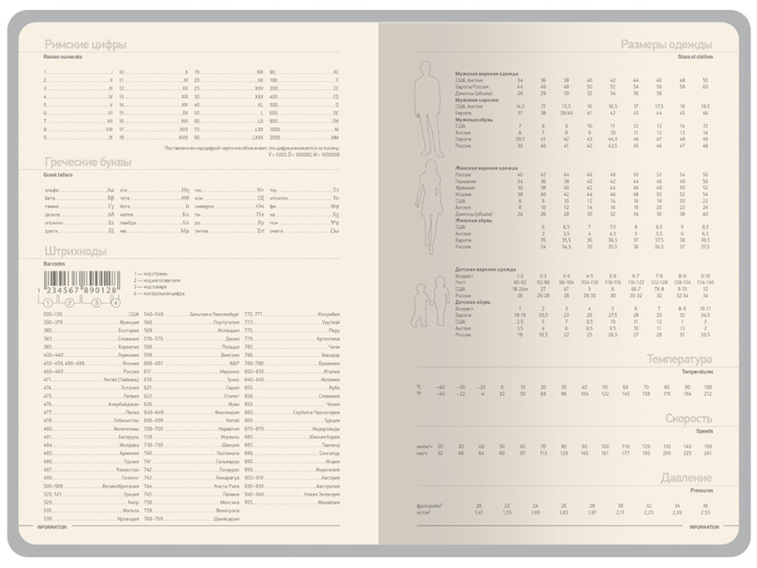 Недатированные страницы в серую линейку имеют отдельное место для проставления числа месяца и дня недели. Справочный блок на 17 страницах содержит полезную информацию из различных областей.