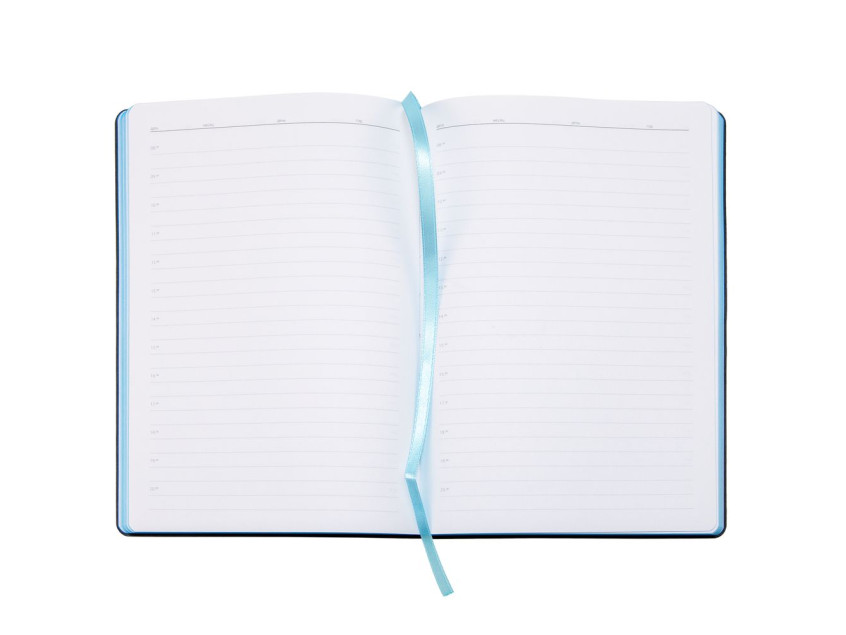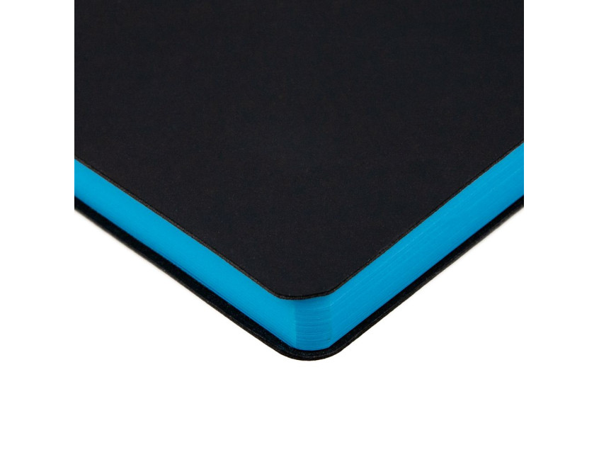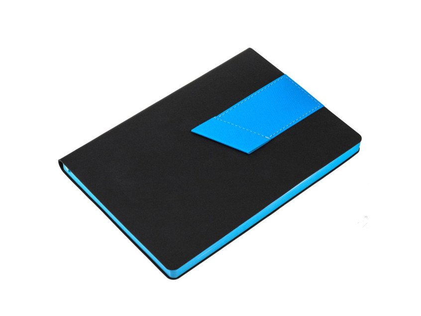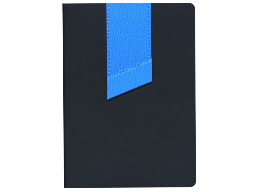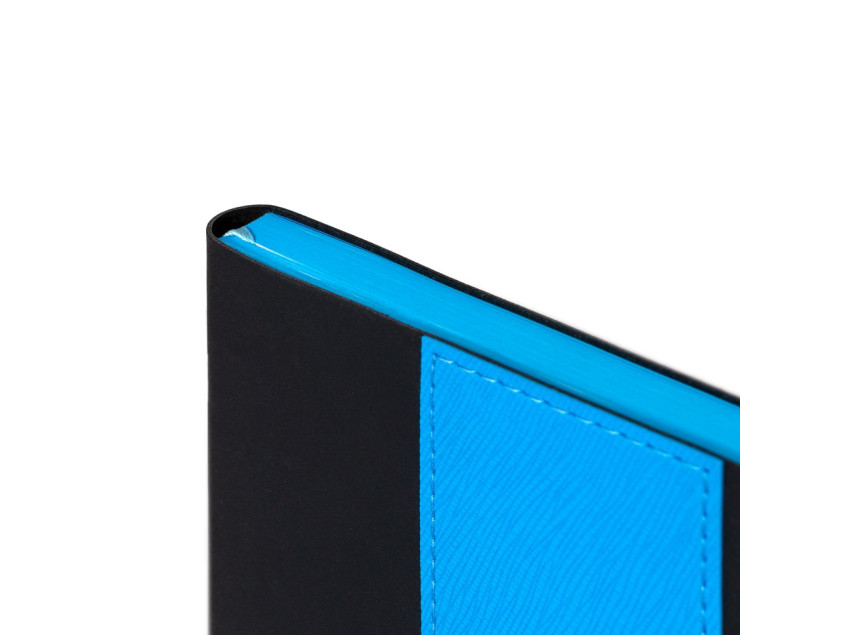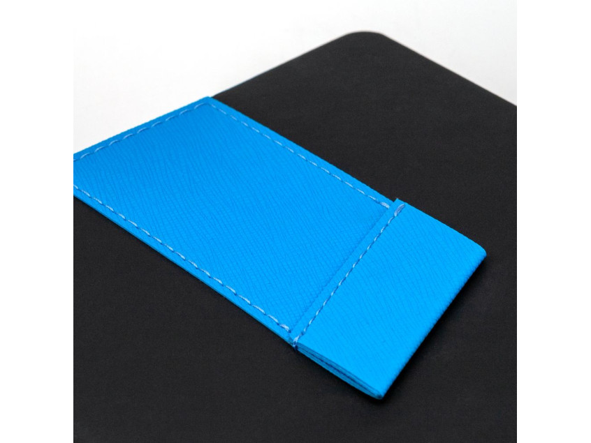 Ежедневник с гибкой обложкой, выполнен из материала Soft Touch, черный АА, дополнен петлей для ручки из материала Nice Touch, голубой JJ и цветным ляссе.