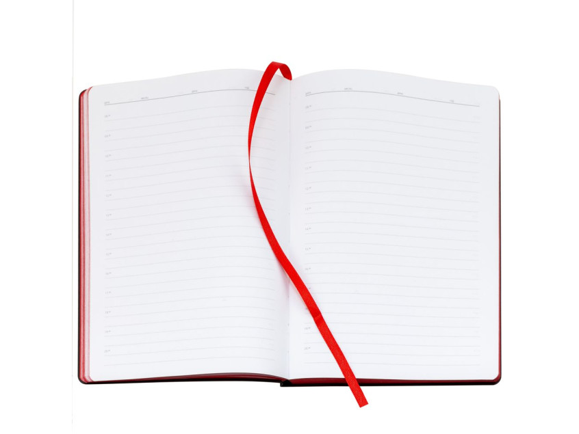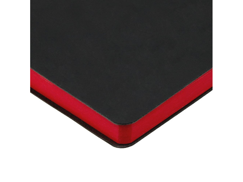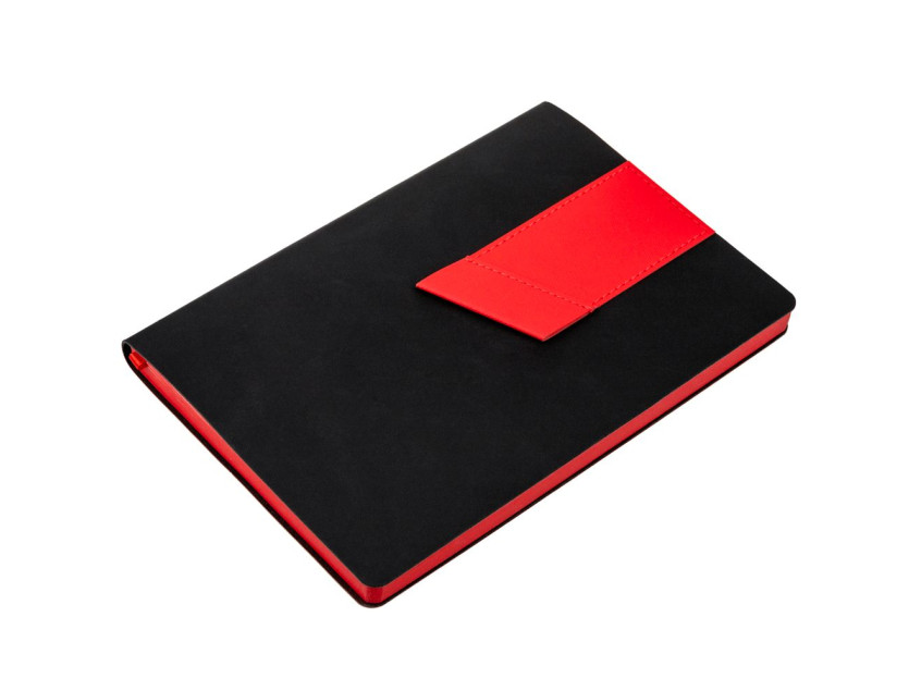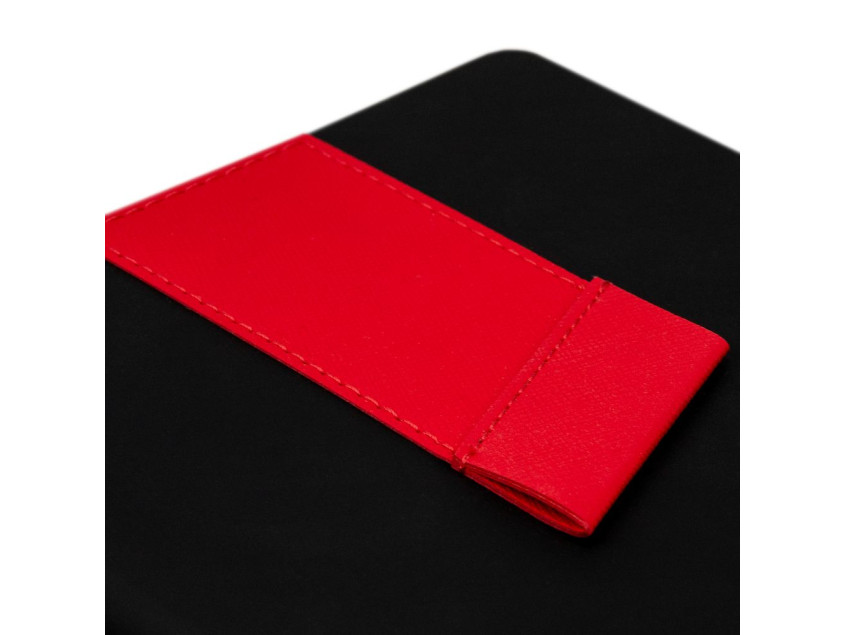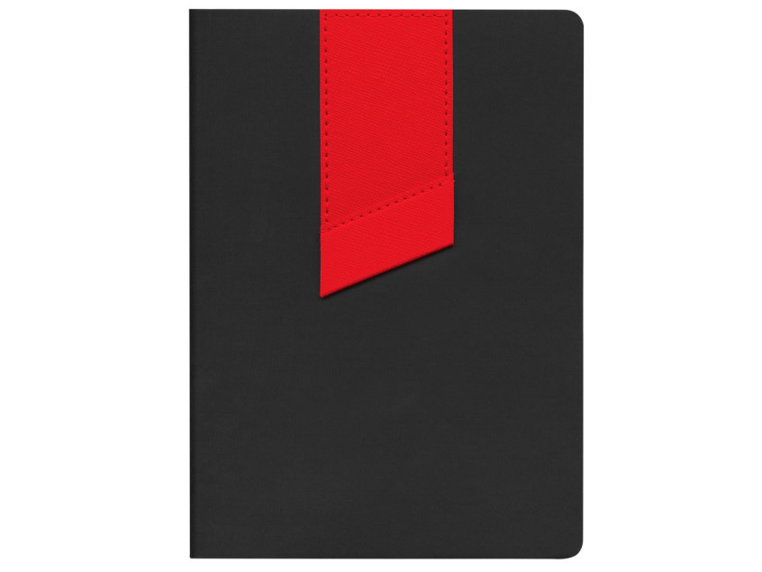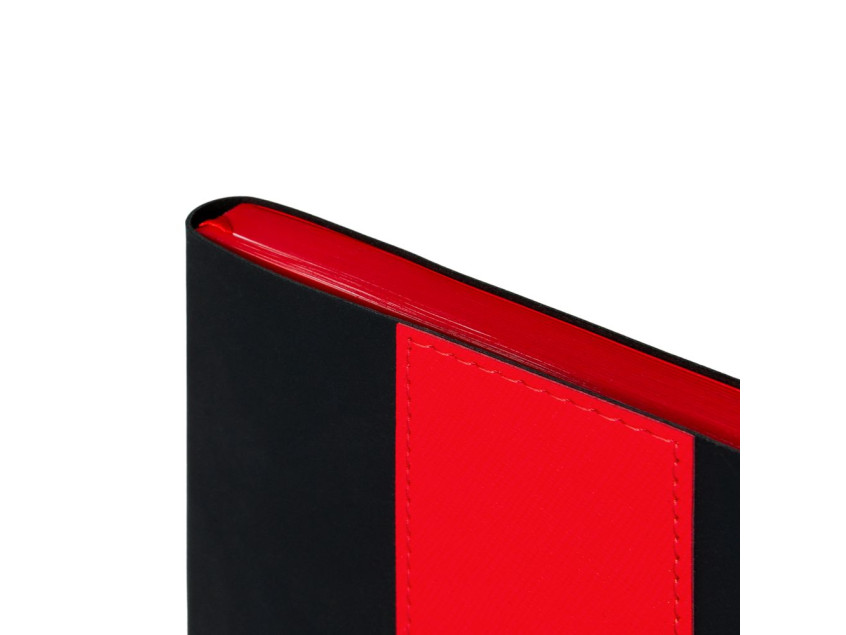 Ежедневник с гибкой обложкой, выполнен из материала Soft Touch, черный АА, дополнен петлей для ручки из материала Nice Touch Ultra, красный РР и цветным ляссе.