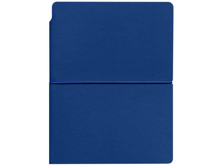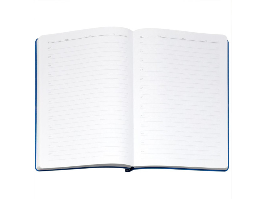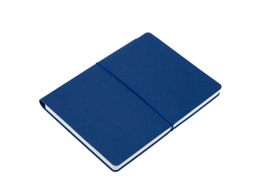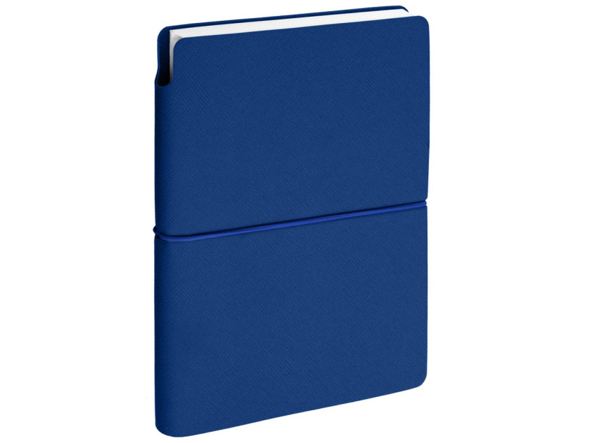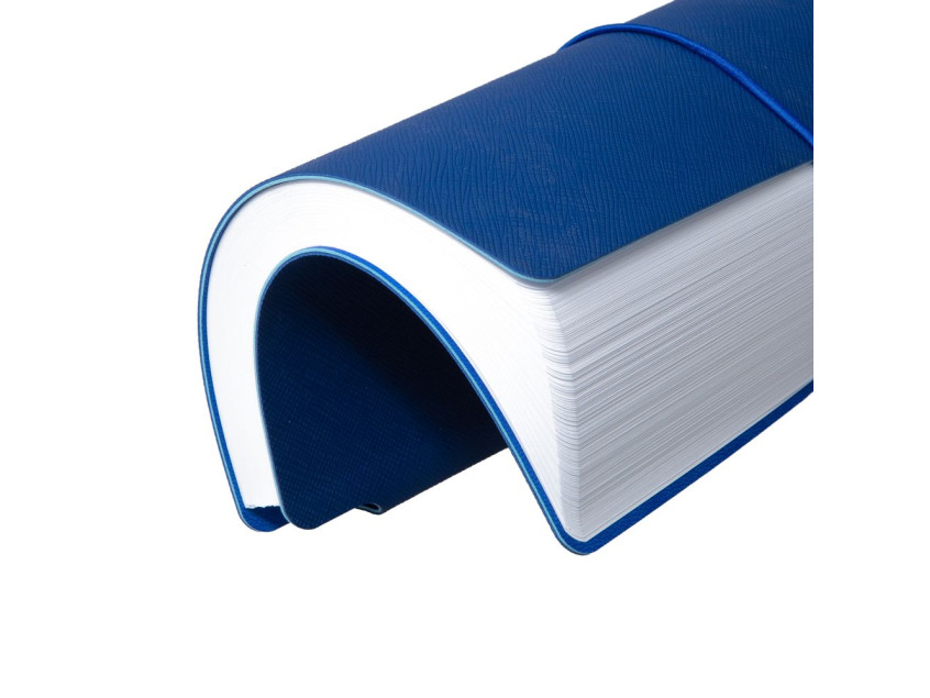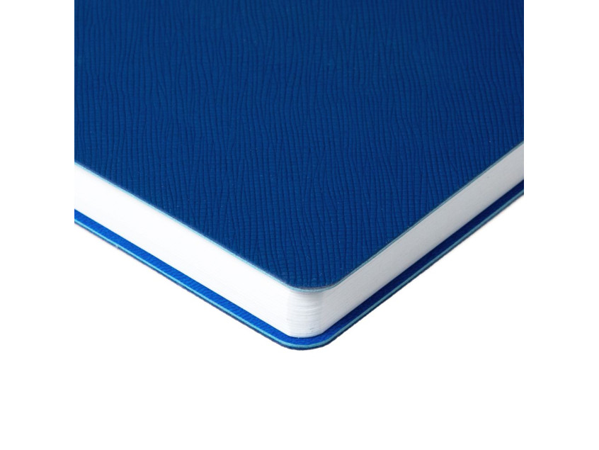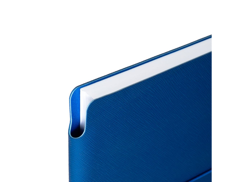 Ежедневник с гибкой обложкой выполнена из материала Nice Touch, синий и Latte, синий (внутренняя часть обложки), дополнен горизонтальной резинкой в цвет обложки. Внутри корешка — специальное место для крепления ручки размером до 15х1 см.