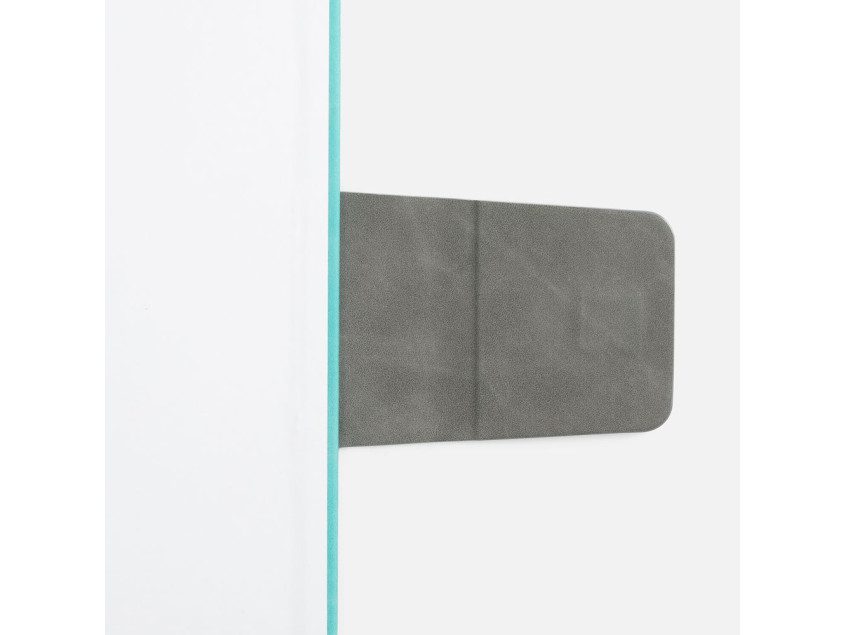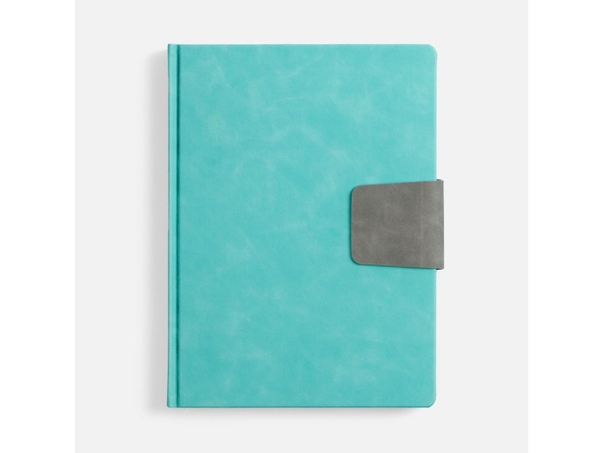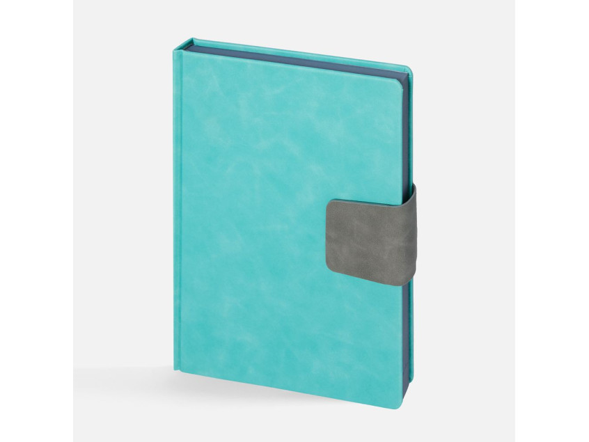 Ежедневник с твердой обложкой, выполнен из материала Nubuck Touch, цвет морской волны II, дополнен капталом, ляссе и обрезом серого цвета. Застежка — хлястик на магните из материала Nubuck Touch, серый СС.