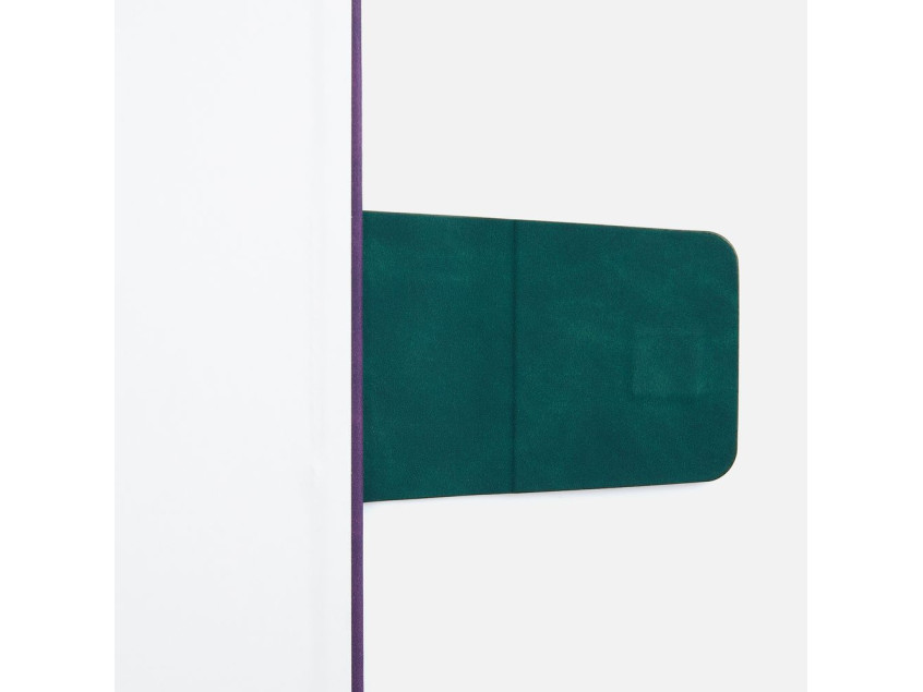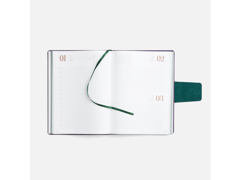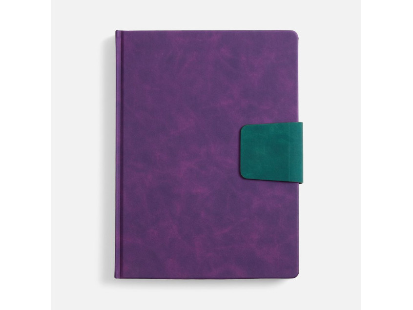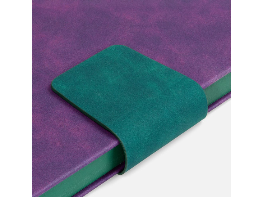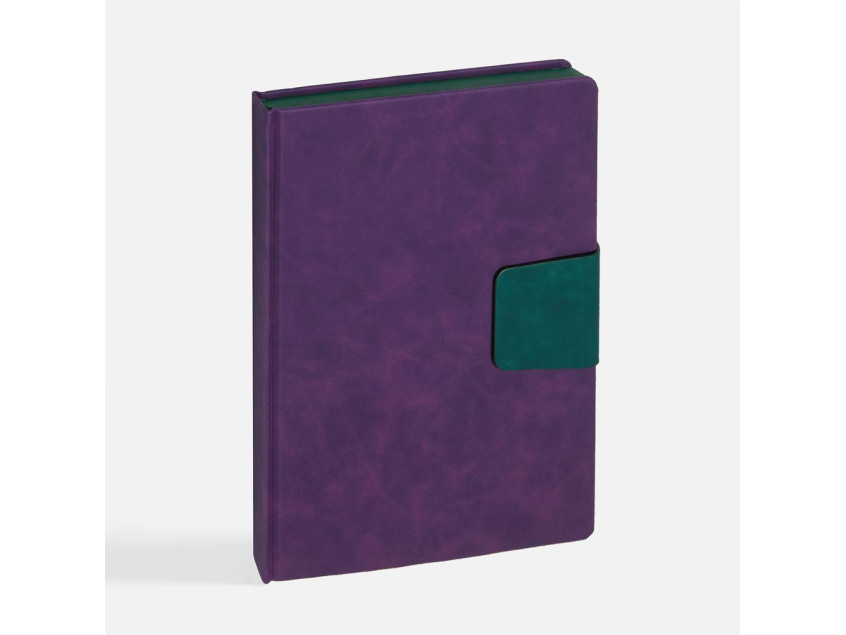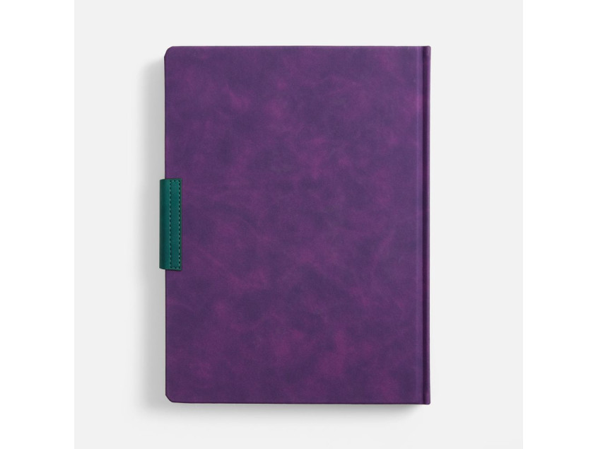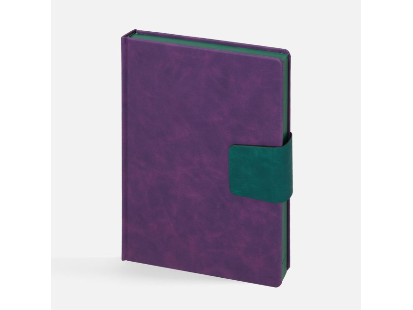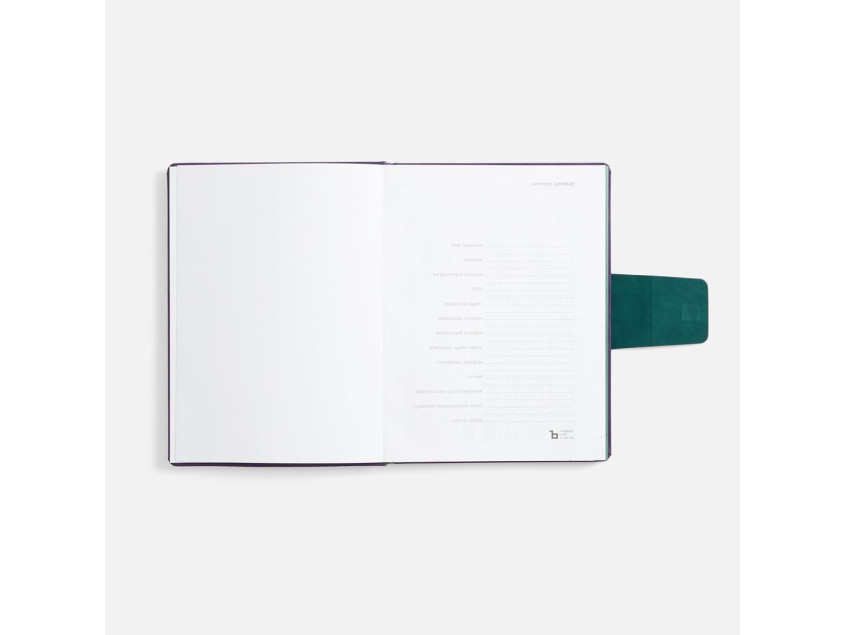 Ежедневник с твердой обложкой, выполнен из материала Nubuck Touch, фиолетовый UU, дополнен капталом, ляссе и обрезом синего цвета. Застежка — хлястик на магните из материала Nubuck Touch, темно-зеленый VV.