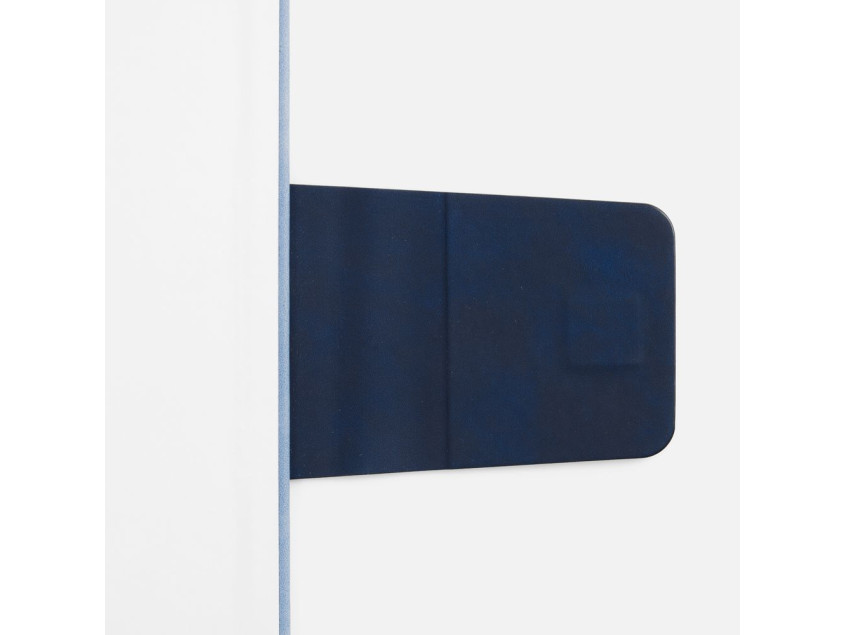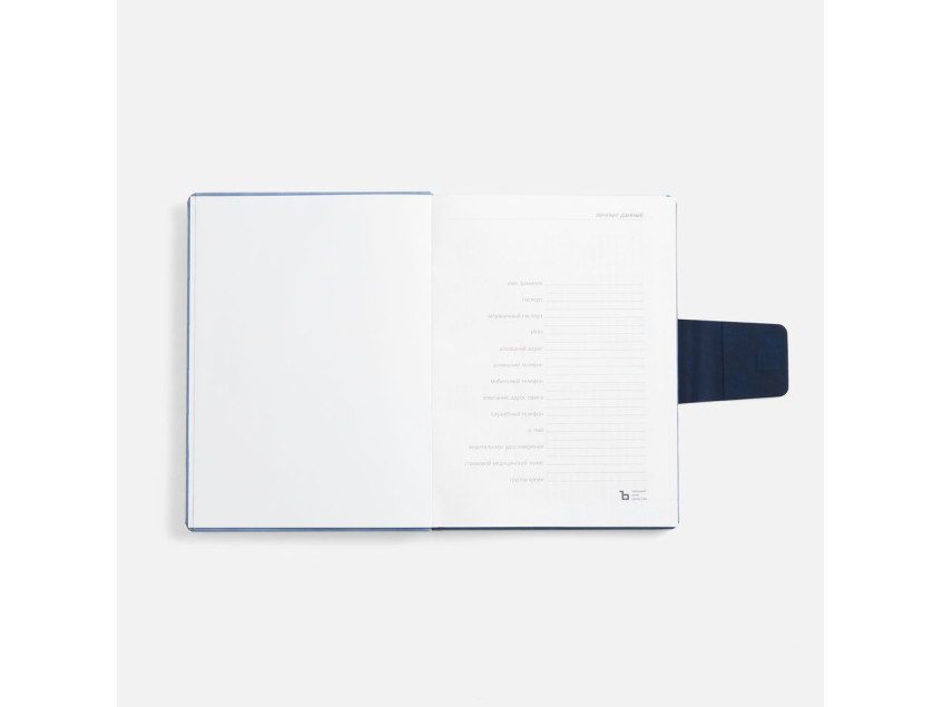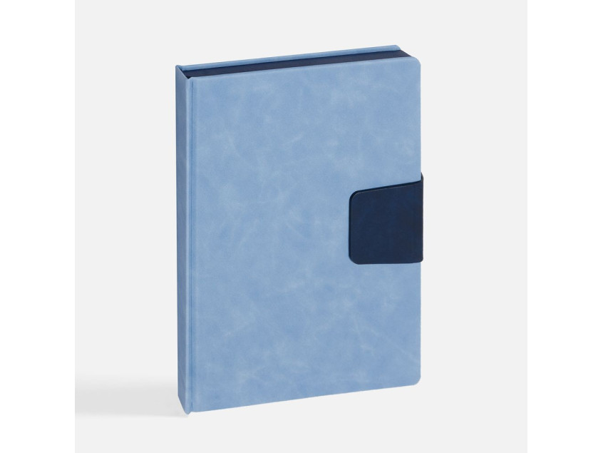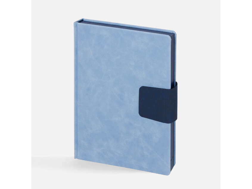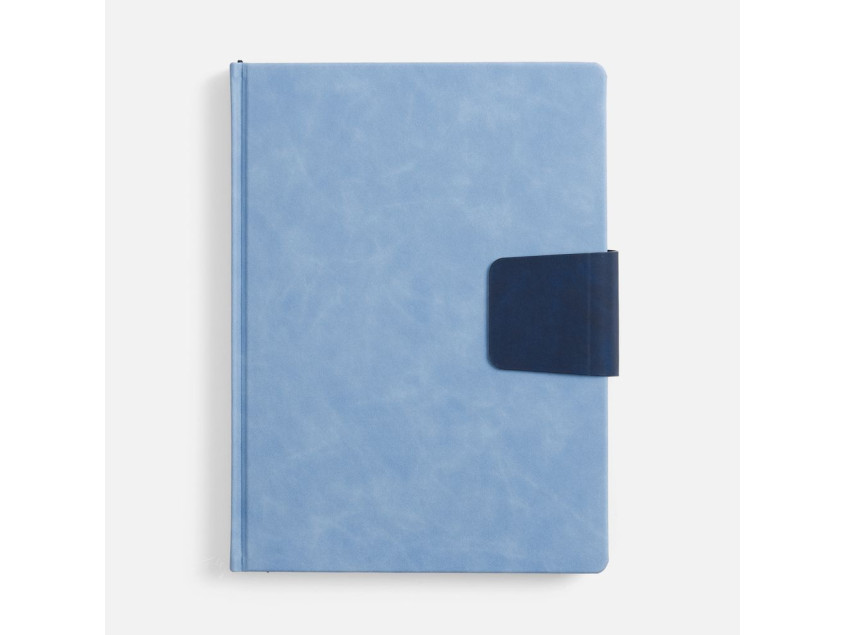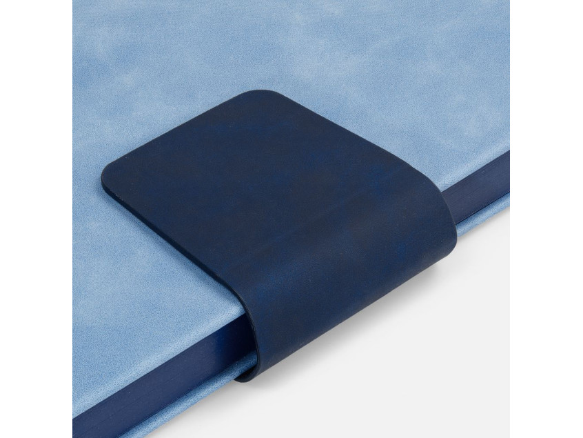 Ежедневник с твердой обложкой, выполнен из материала Nubuck Touch, голубой JJ, дополнен капталом, ляссе и обрезом синего цвета. Застежка — хлястик на магните из материала Nubuck Touch, темно-синий ХХ.