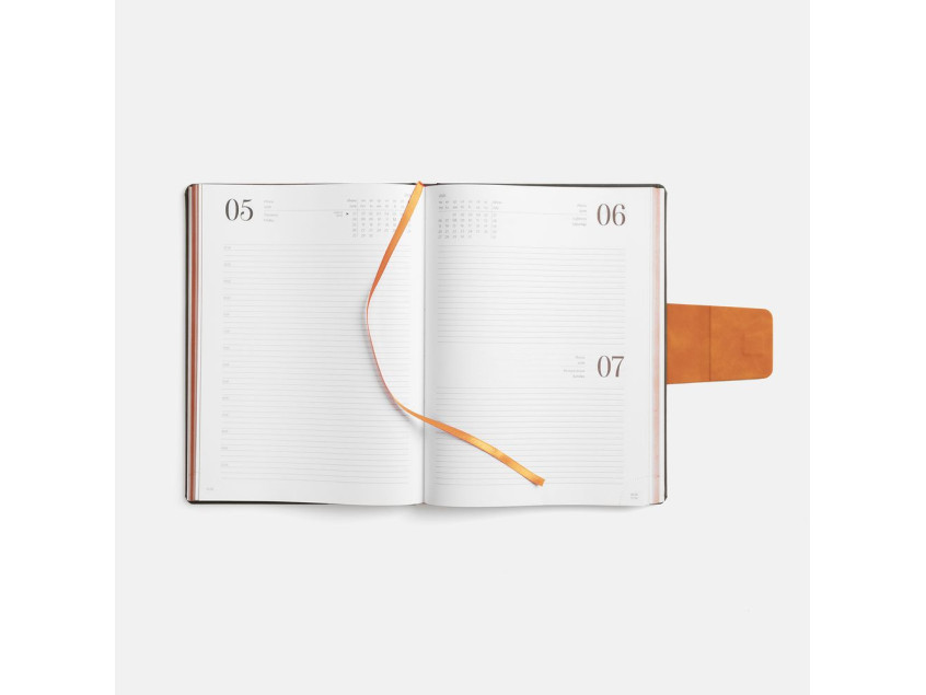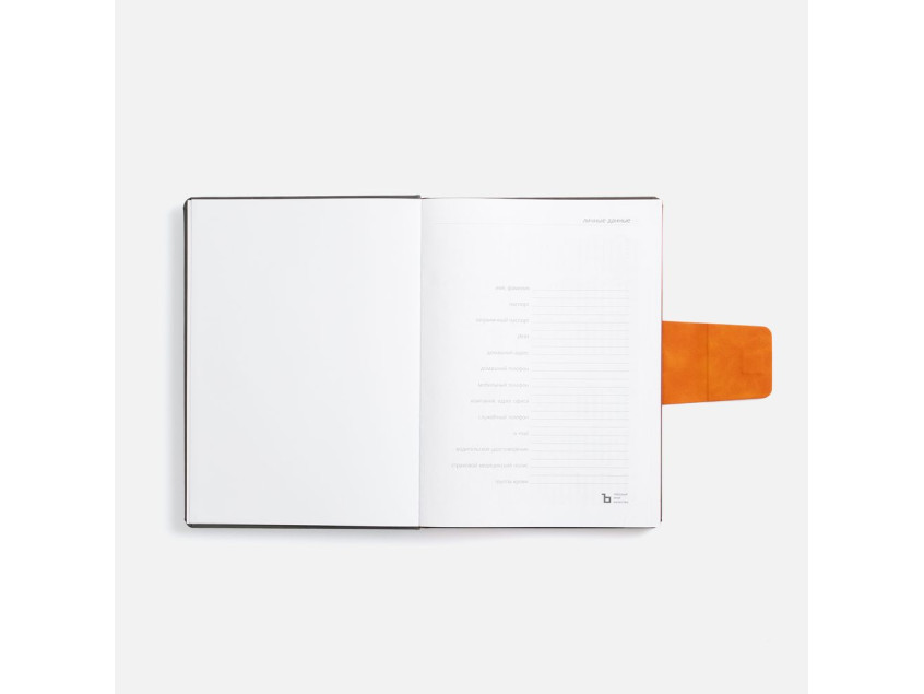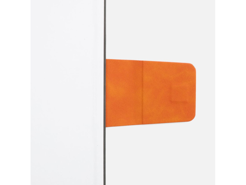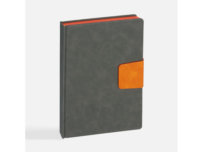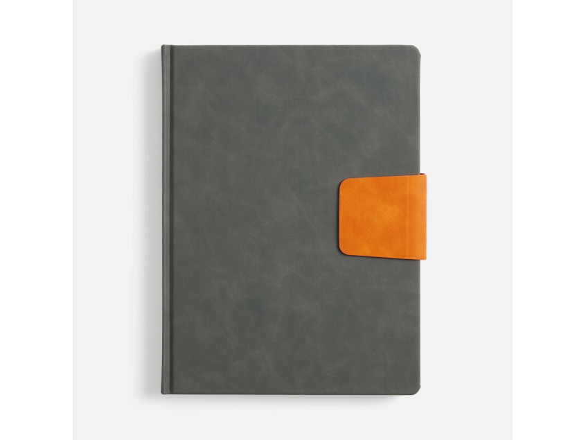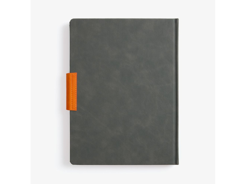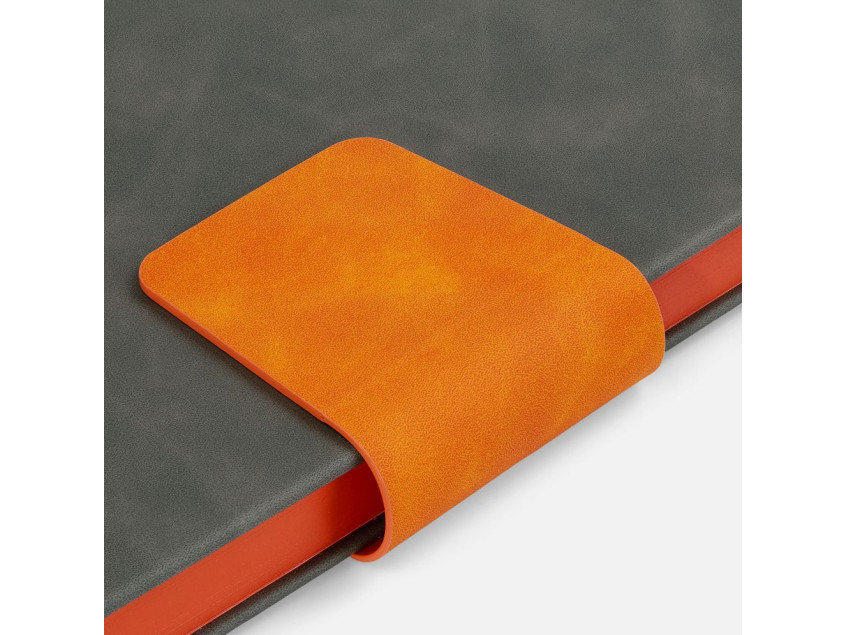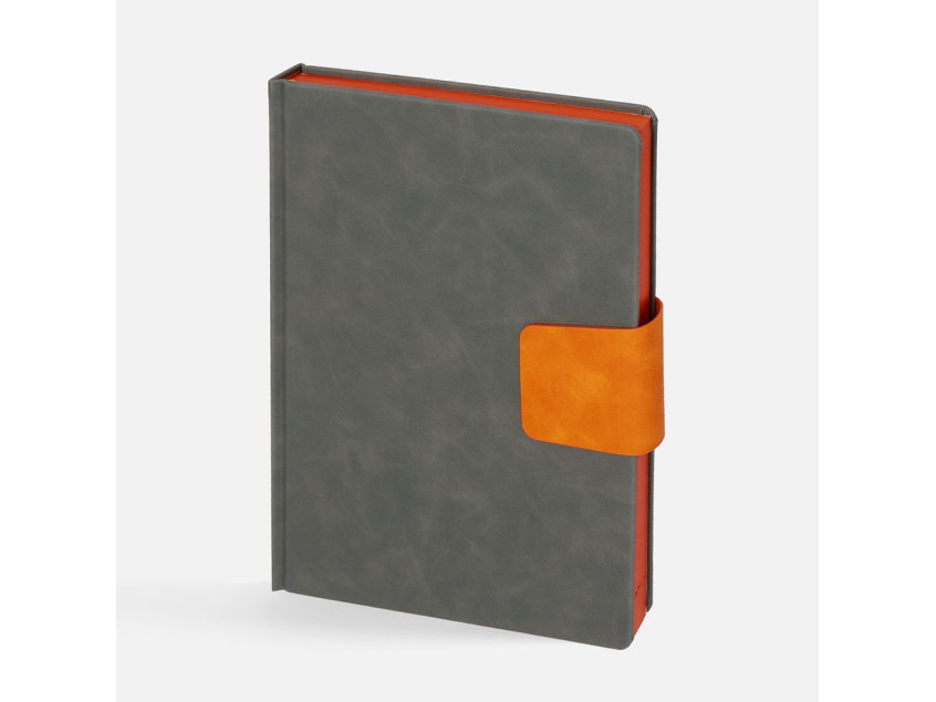 Ежедневник с твердой обложкой, выполнен из материала Nubuck Touch, серый СС, дополнен капталом, ляссе и обрезом оранжевого цвета. Застежка — хлястик на магните из материала Nubuck Touch Ultra, оранжевый ОО.
