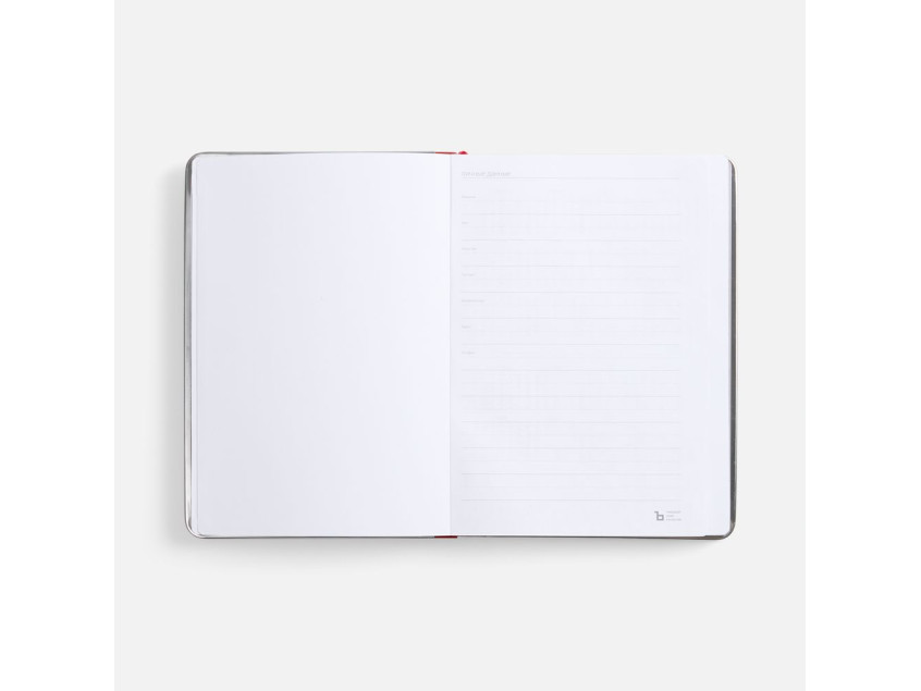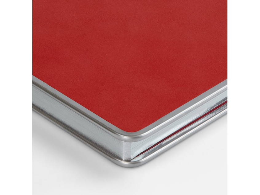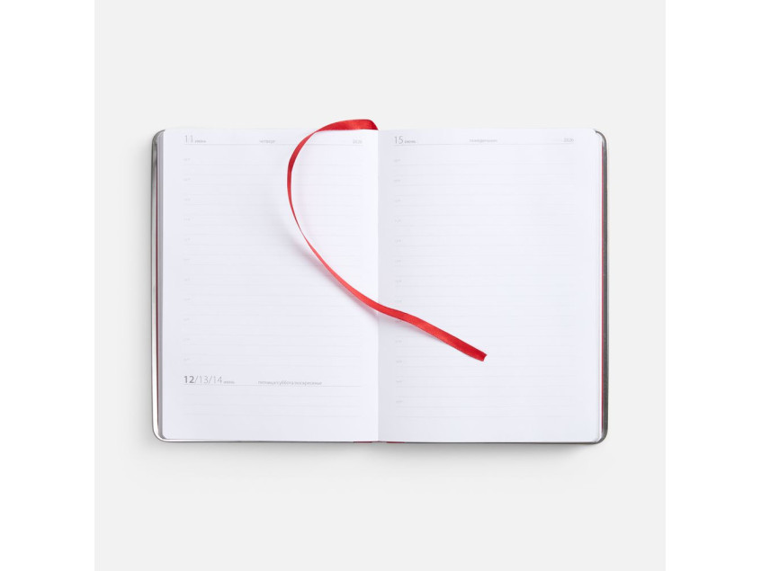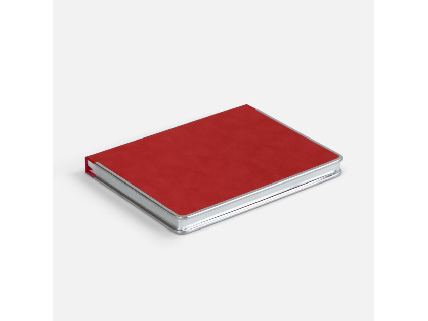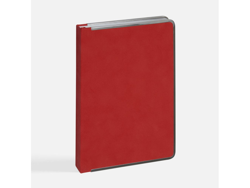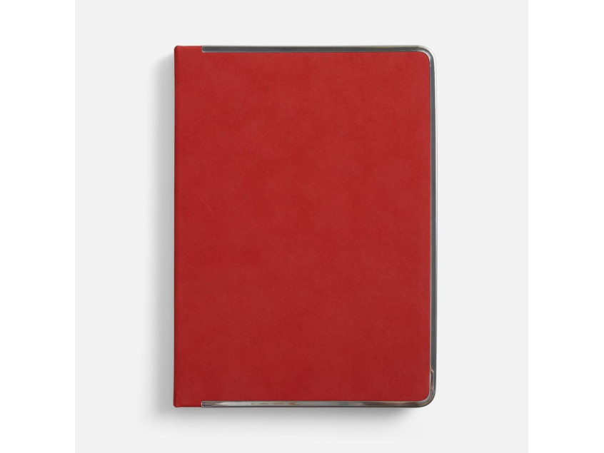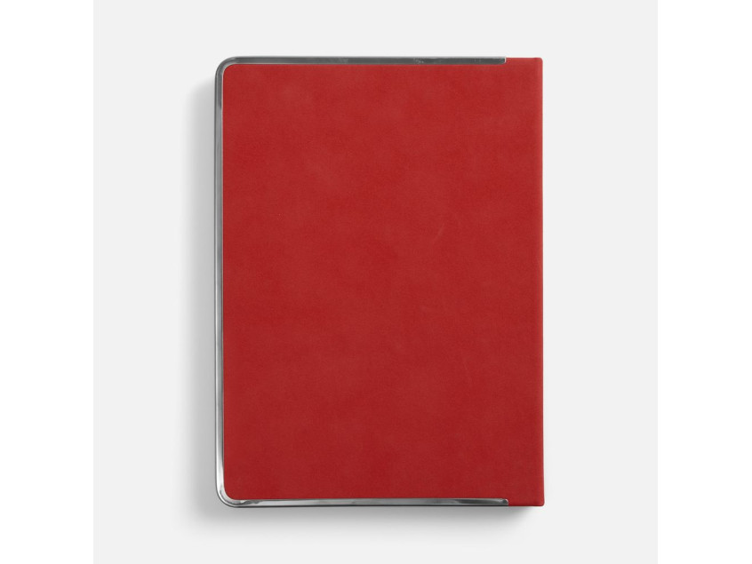 Ежедневник с твердой обложкой и серебристым обрезом блока. Выполнен из материала Nubuck, красный РР, дополнен красным ляссе и металлическими рамками с двух сторон обложки.