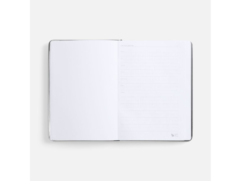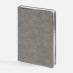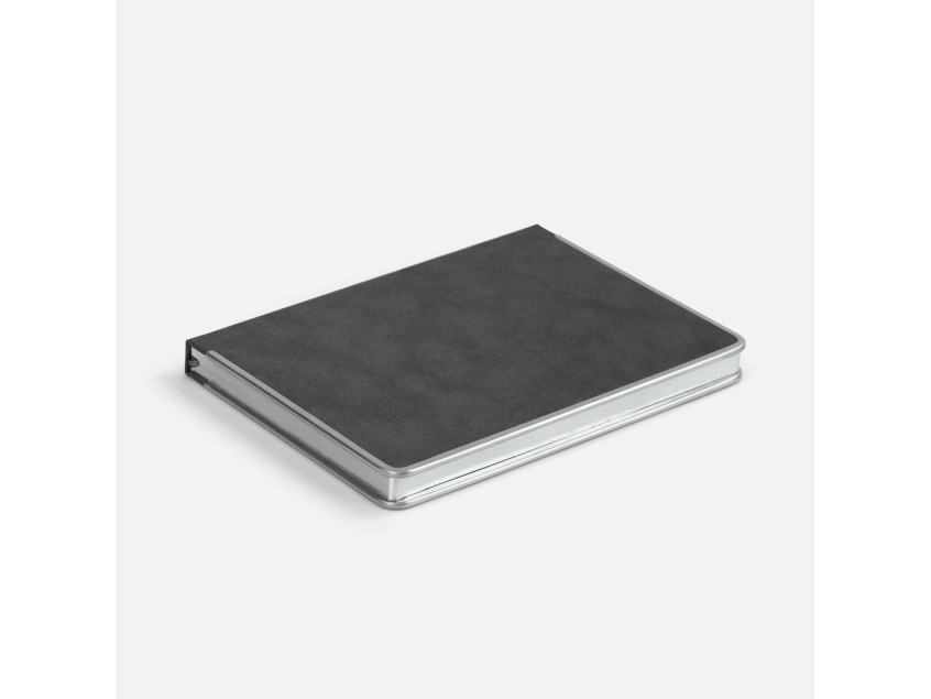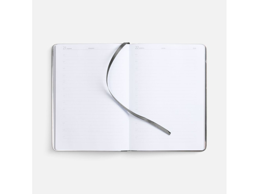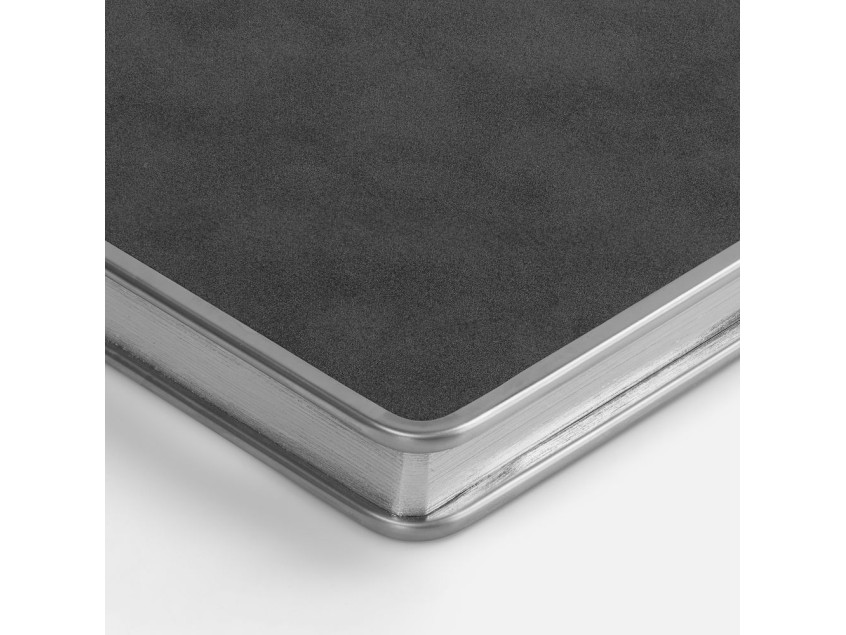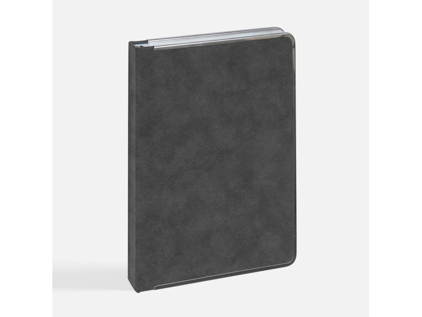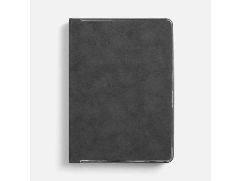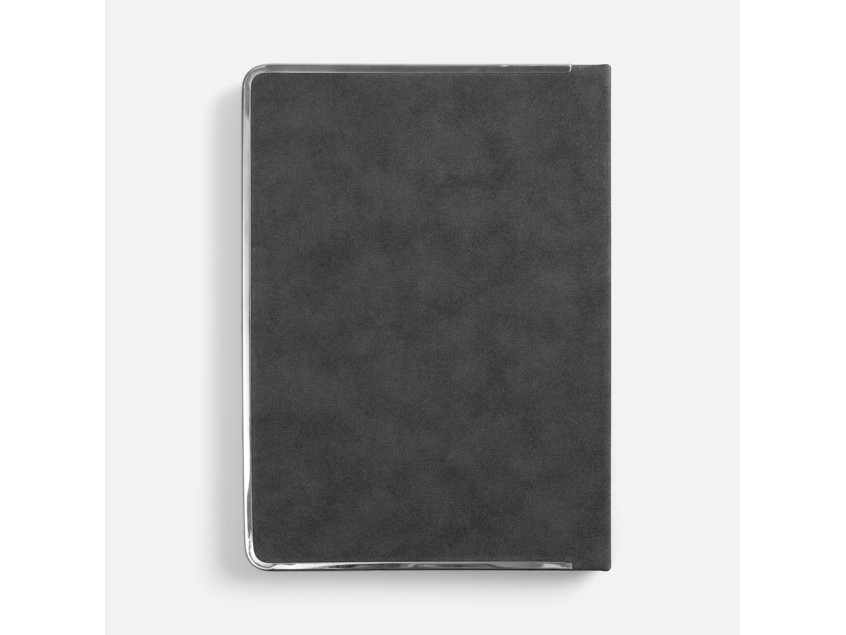 Ежедневник с твердой обложкой и серебристым обрезом блока. Выполнен из материала Nubuck, темно-серый ЕЕ, дополнен серым ляссе и металлическими рамками с двух сторон обложки.