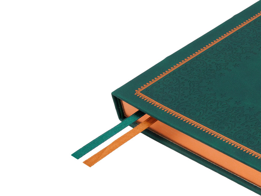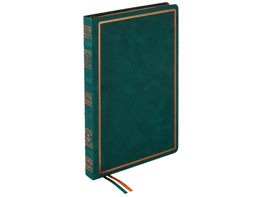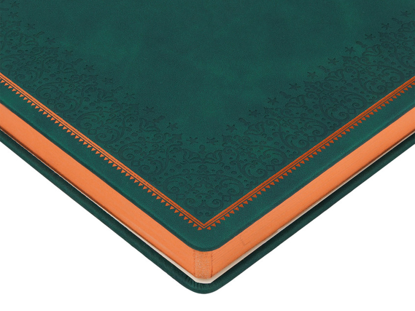 Недатированный ежедневник Royal формата А4 с твердой обложкой из искусственной кожи с имитацией нубука украшен художественным бронзовым и блинтовым тиснением. Внутри 192 страницы, выполненные из качественной бежевой бумаги в линейку плотностью 140 г/м². Два шелковых ляссе в цвет обреза блока и обложки облегчают навигацию по записям. Французский корешок дополнительно декорирован изящным бронзовым тиснением в виде виньеток. Скругленные углы обложки и блока подчеркивают стильный дизайн изделия, а блеск бронзового обреза дарит ежедневнику благородный и роскошный внешний вид.