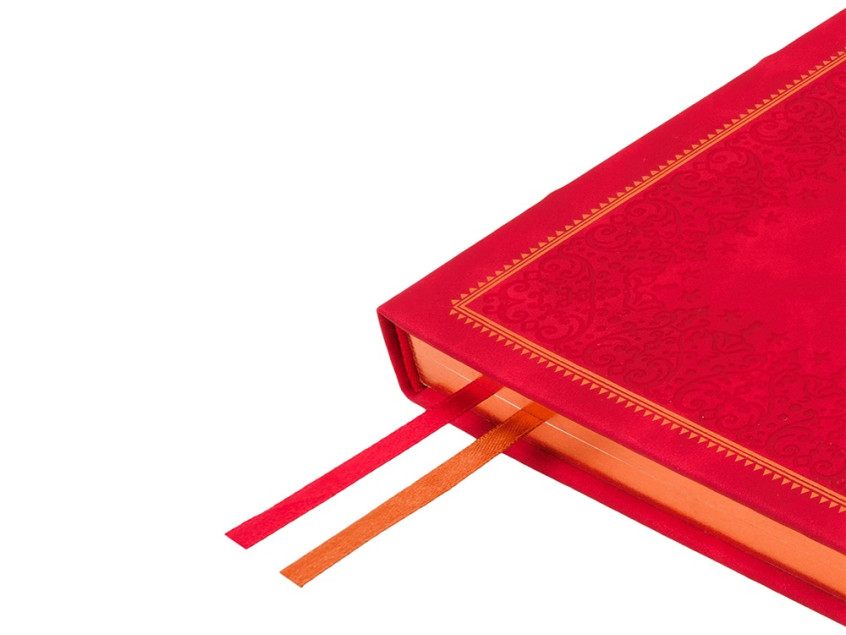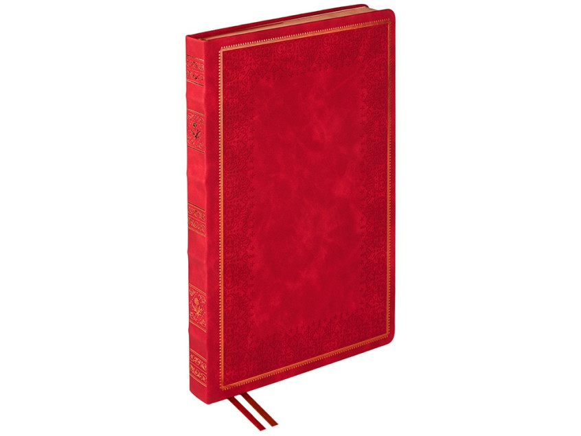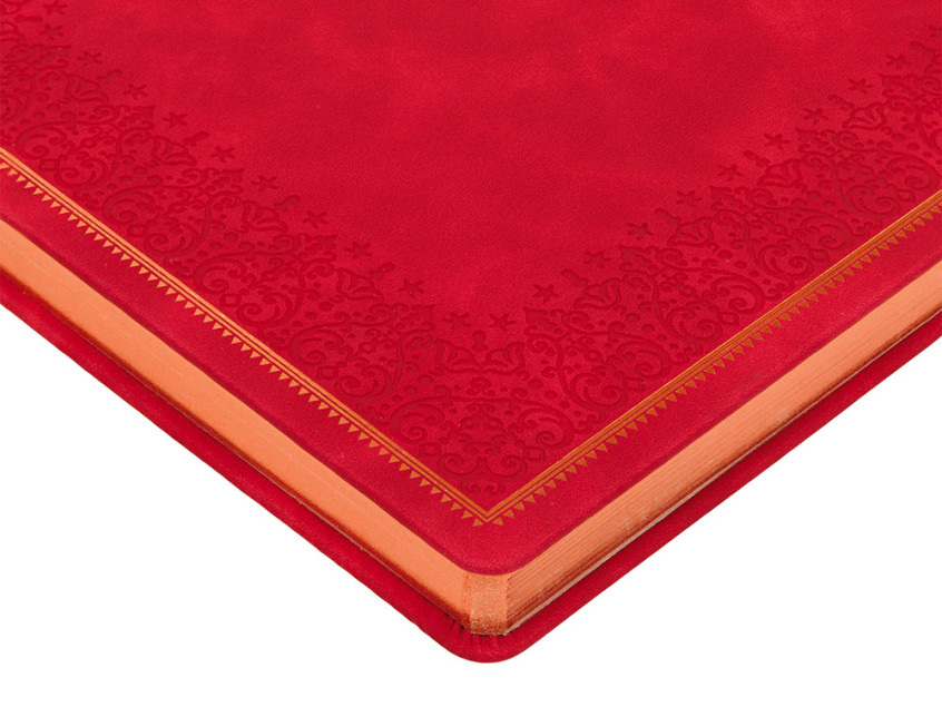 Недатированный ежедневник Royal формата А4 с твердой обложкой из искусственной кожи с имитацией нубука украшен художественным бронзовым и блинтовым тиснением. Внутри 192 страницы, выполненные из качественной бежевой бумаги в линейку плотностью 140 г/м². Два шелковых ляссе в цвет обреза блока и обложки облегчают навигацию по записям. Французский корешок дополнительно декорирован изящным бронзовым тиснением в виде виньеток. Скругленные углы обложки и блока подчеркивают стильный дизайн изделия, а блеск бронзового обреза дарит ежедневнику благородный и роскошный внешний вид.