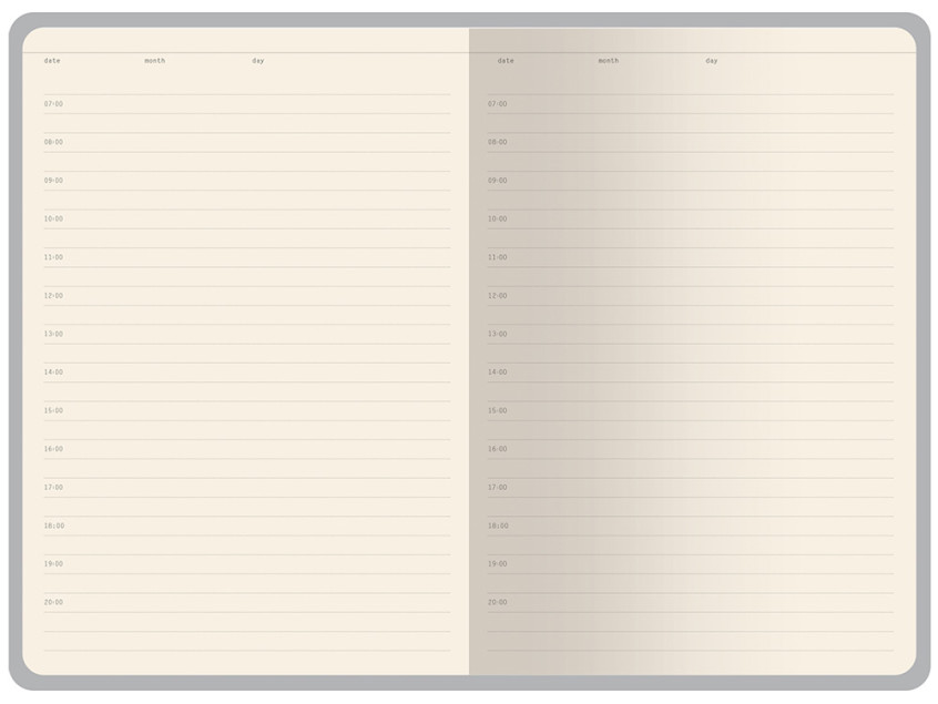Бумажный блок, закрепленный книжным переплетом, выполнен из бежевой офсетной бумаги плотностью 70 г/ кв м. Внутри блока есть страница для персональных данных, справочная информация на 13 страницах. Блок для записей имеет линовку с указанием временных интервалов в один час.