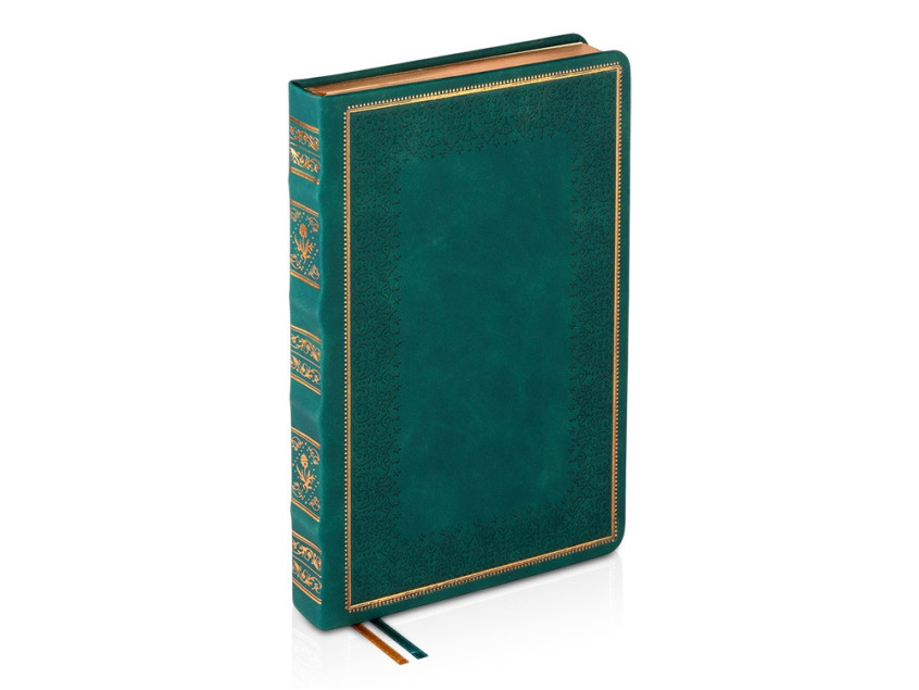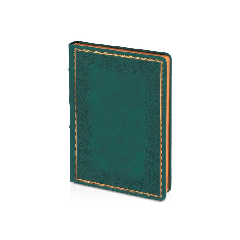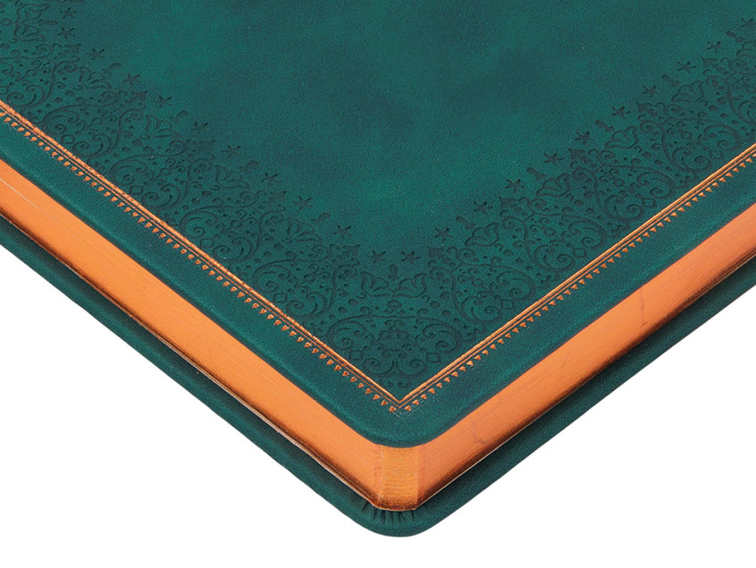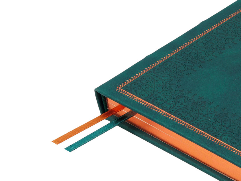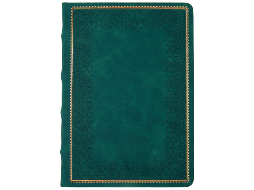 Недатированный ежедневник Royal формата А5 с твердой обложкой из искусственной кожи с имитацией нубука украшен художественным бронзовым и блинтовым тиснением. Внутри 256 страниц, выполненных из качественной бежевой бумаги в линейку плотностью 100 г/м². Два шелковых ляссе в цвет обреза блока и обложки облегчают навигацию по записям. Французский корешок дополнительно декорирован изящным бронзовым тиснением в виде виньеток. Скругленные углы обложки и блока подчеркивают стильный дизайн изделия, а блеск бронзового обреза дарит ежедневнику благородный и роскошный внешний вид.
