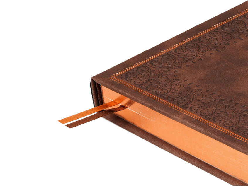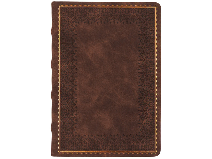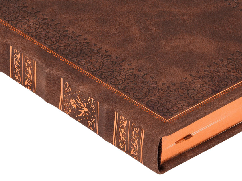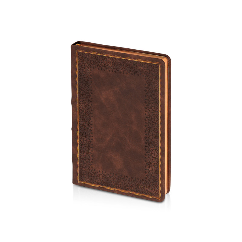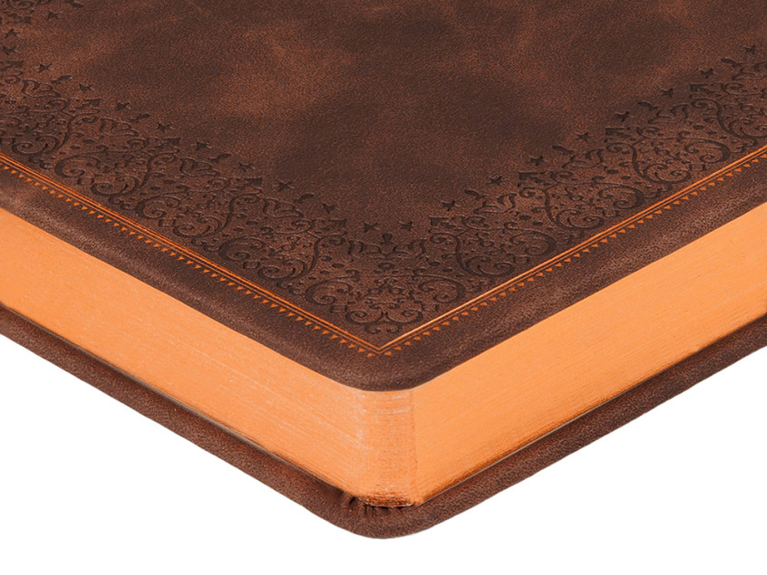 Недатированный ежедневник Royal формата А5 с твердой обложкой из искусственной кожи с имитацией нубука украшен художественным бронзовым и блинтовым тиснением. Внутри 256 страниц, выполненных из качественной бежевой бумаги в линейку плотностью 100 г/м². Два шелковых ляссе в цвет обреза блока и обложки облегчают навигацию по записям. Французский корешок дополнительно декорирован изящным бронзовым тиснением в виде виньеток. Скругленные углы обложки и блока подчеркивают стильный дизайн изделия, а блеск бронзового обреза дарит ежедневнику благородный и роскошный внешний вид.