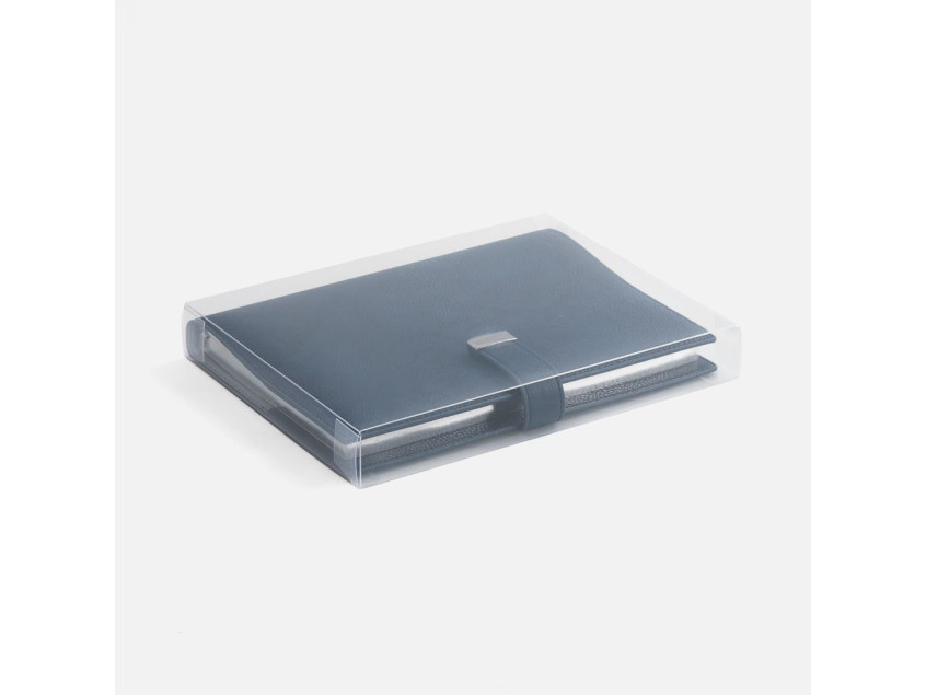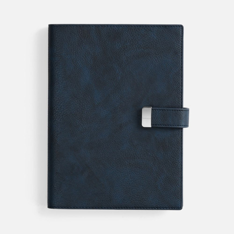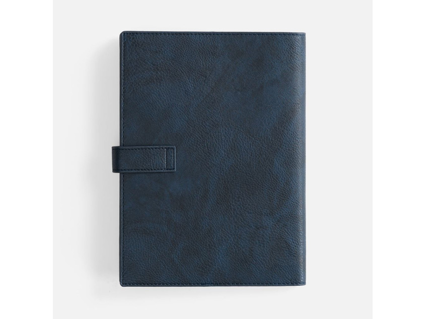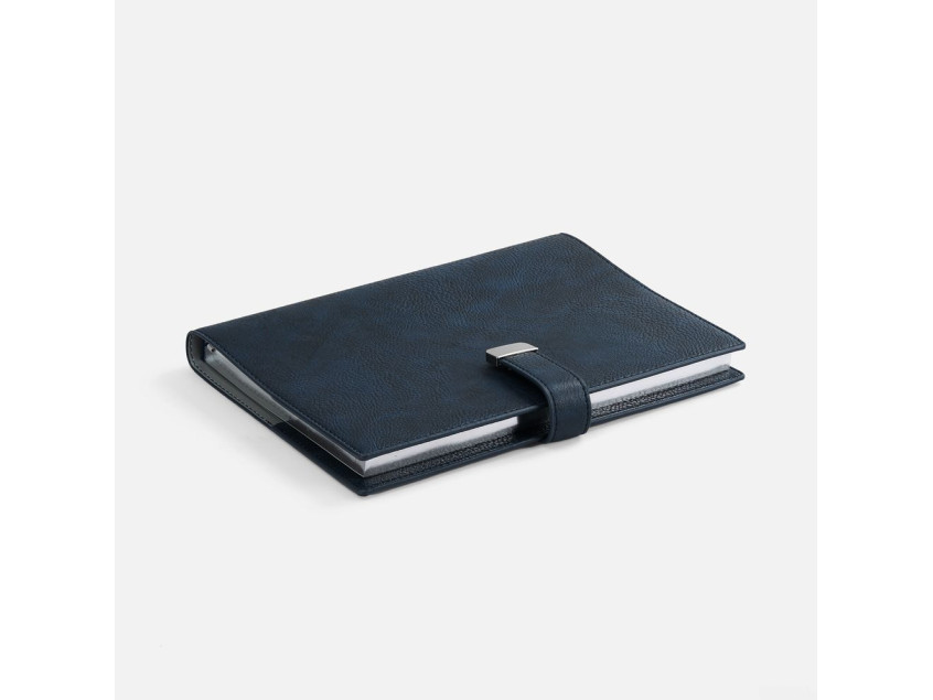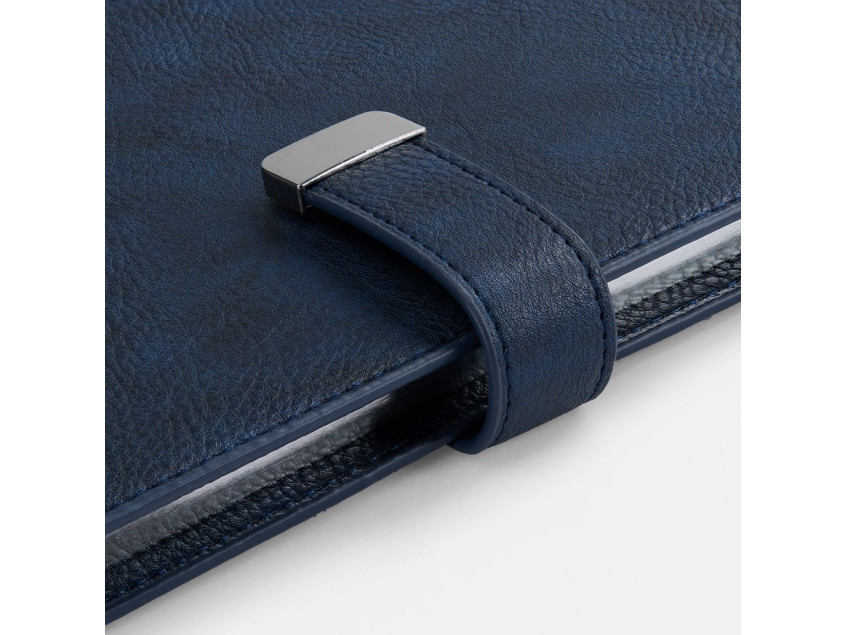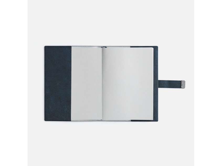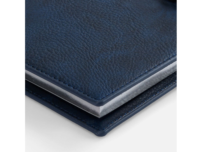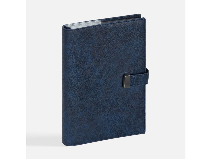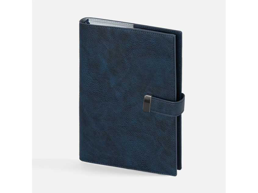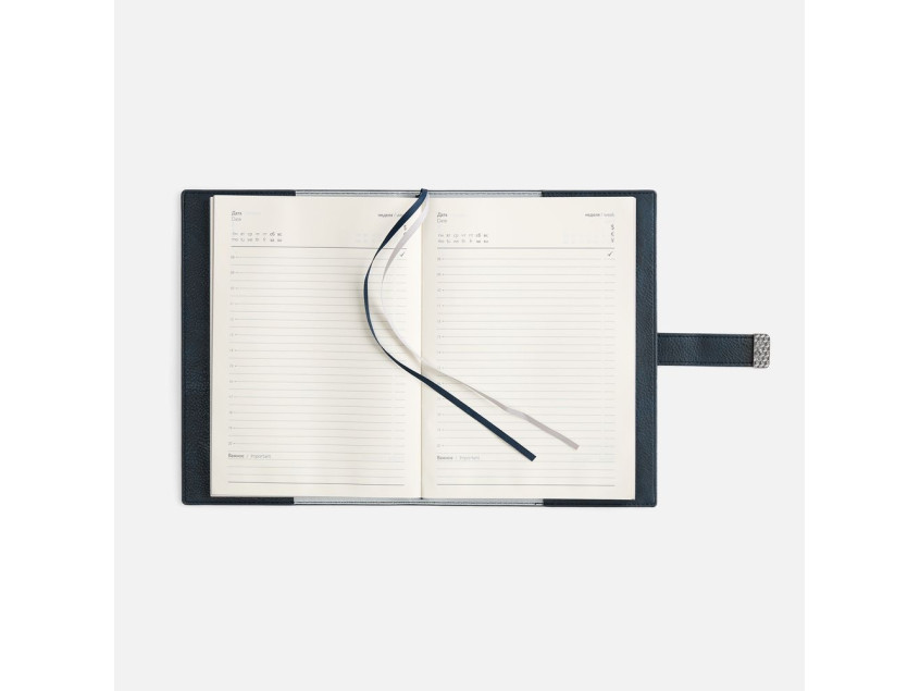 Ежедневник в мягком переплете со съёмная обложкой, дополнен застёжкой-хлястиком с металлическим шильдом на кнопке, двойным ляссе и капталом.