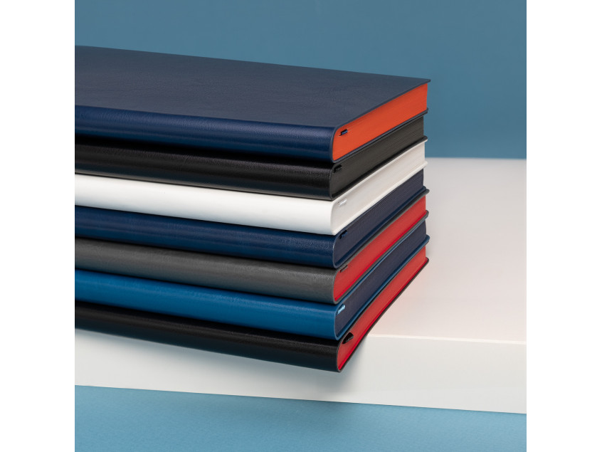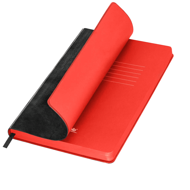 Эффектный недатированный ежедневник выполнен в гибкой обложке со скругленными уголками из искусственной кожи с эффектом «венецианской штукатурки». На ощупь поверхность гладкая, глянцевая, фактурно ощущается характерный для кожи мелкий рельеф. Не образует заломов, не расслаивается. Цвет обложки – классический черный, глубокий, густой, однородный. Тон за счет фактуры может меняться в зависимости от освещения. Цвет матовых форзаца и нахзаца – красный, насыщенный, динамичный. Ярко контрастирует с обложкой. Срез матовый, выполнен в тон форзаца и нахзаца. Страницы со скругленными уголками теплого светло-кремового оттенка из гладкого шелковистого офсета. Одинарное атласное черное ляссе с легким глянцевым отливом. Ширина ляссе 6 мм.