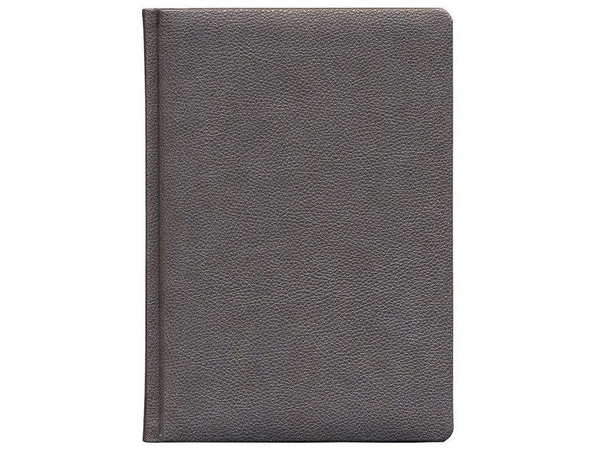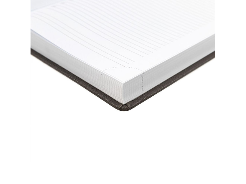 Ежедневник в твердой обложке c поролоном, выполнен из материала La Fite, темно-серый EE, дополнен ляссе серого цвета и прошивкой по периметру обложки.