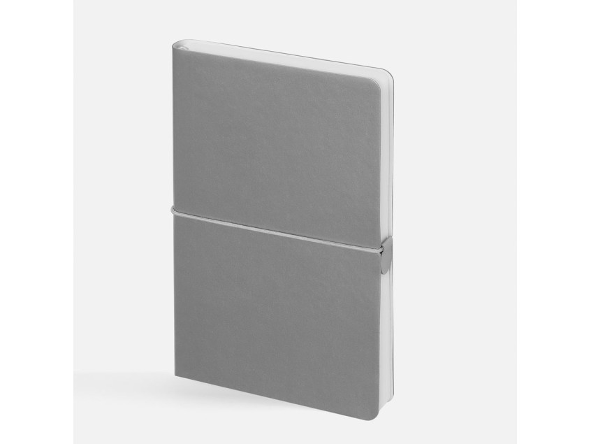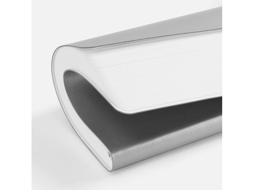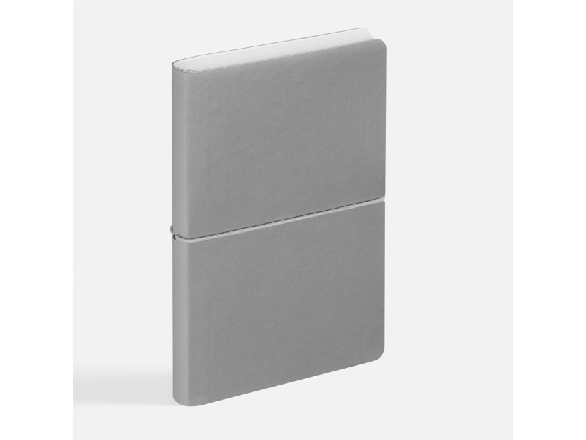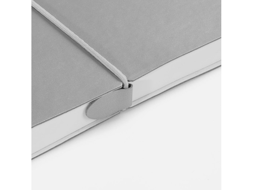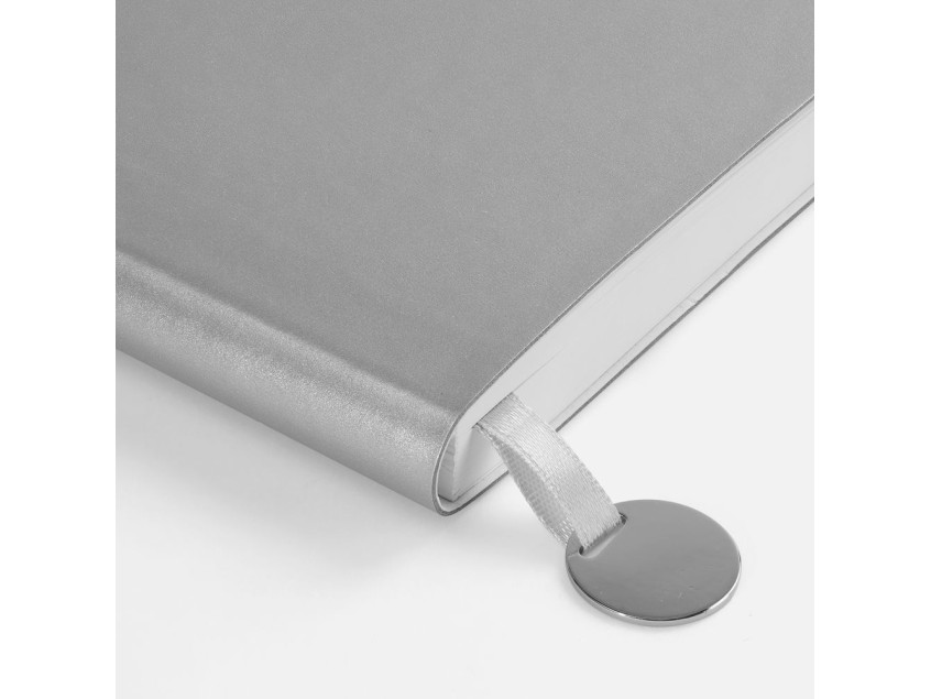 Ежедневник с гибкой обложкой, выполнен из материала Waltz, серебристый DD, дополнен ляссе в цвет обложки с металлическим шильдом.