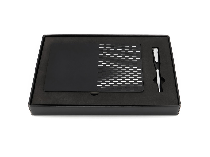 Подарочный набор в стильной цветной картонной коробке черного цвета (крышкой-дно). Внутри на аккуратном ложементе располагаются ежедневник А5 и элегантная металлическая ручка - флешка емкостью 64 ГБ.